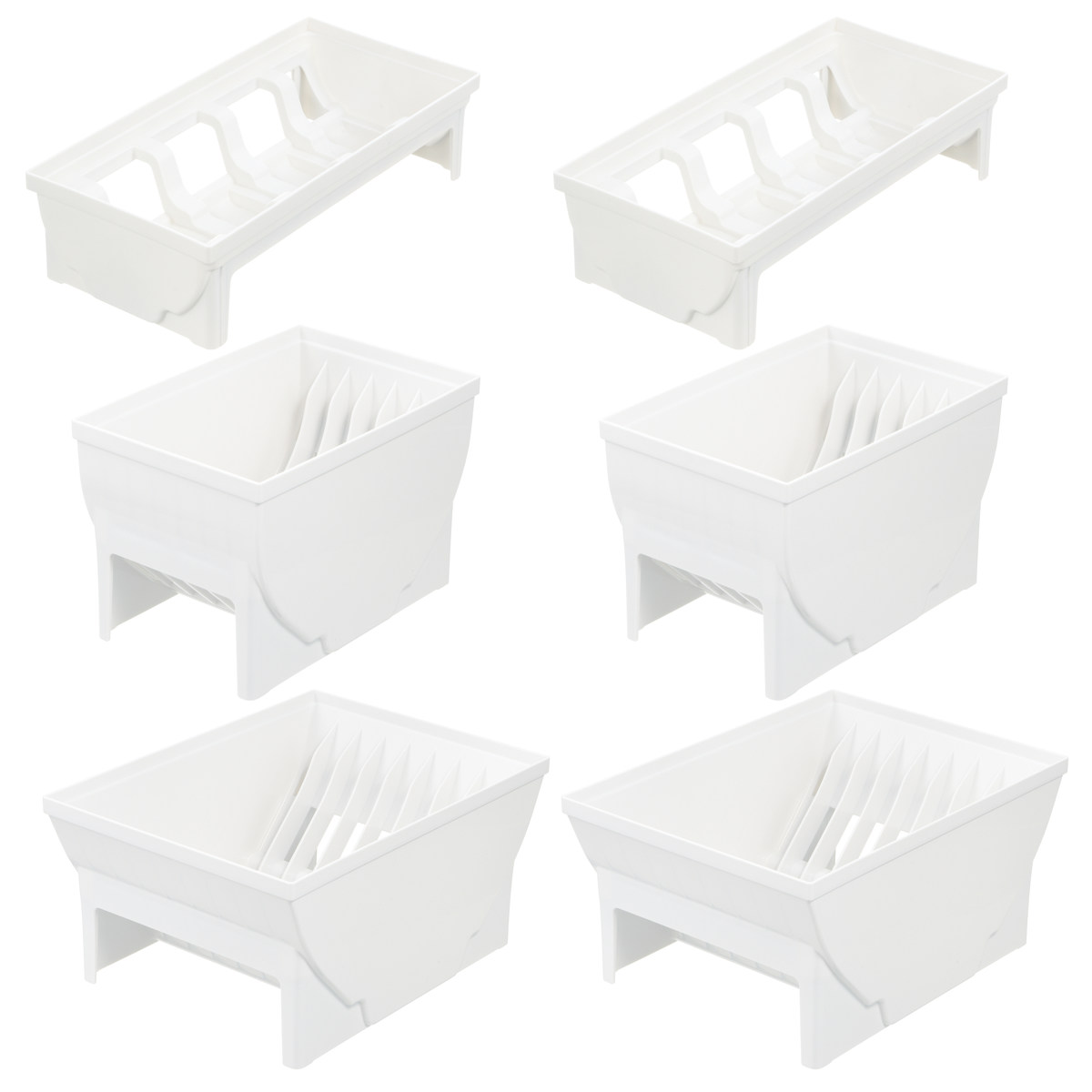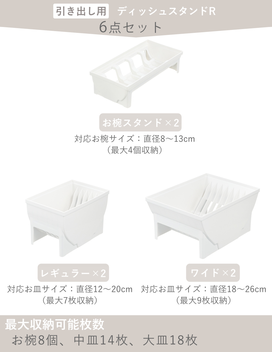 お椀スタンド(8~13cmのお椀やボウル)、ディッシュスタンドのミニ(8~13cm)、レギュラー(12~20cm)、ワイド(18~26cm)の4種類をご用意。使う場所や入れる食器に合わせて自由な組み合わせで深引き出しの整理整頓ができます。