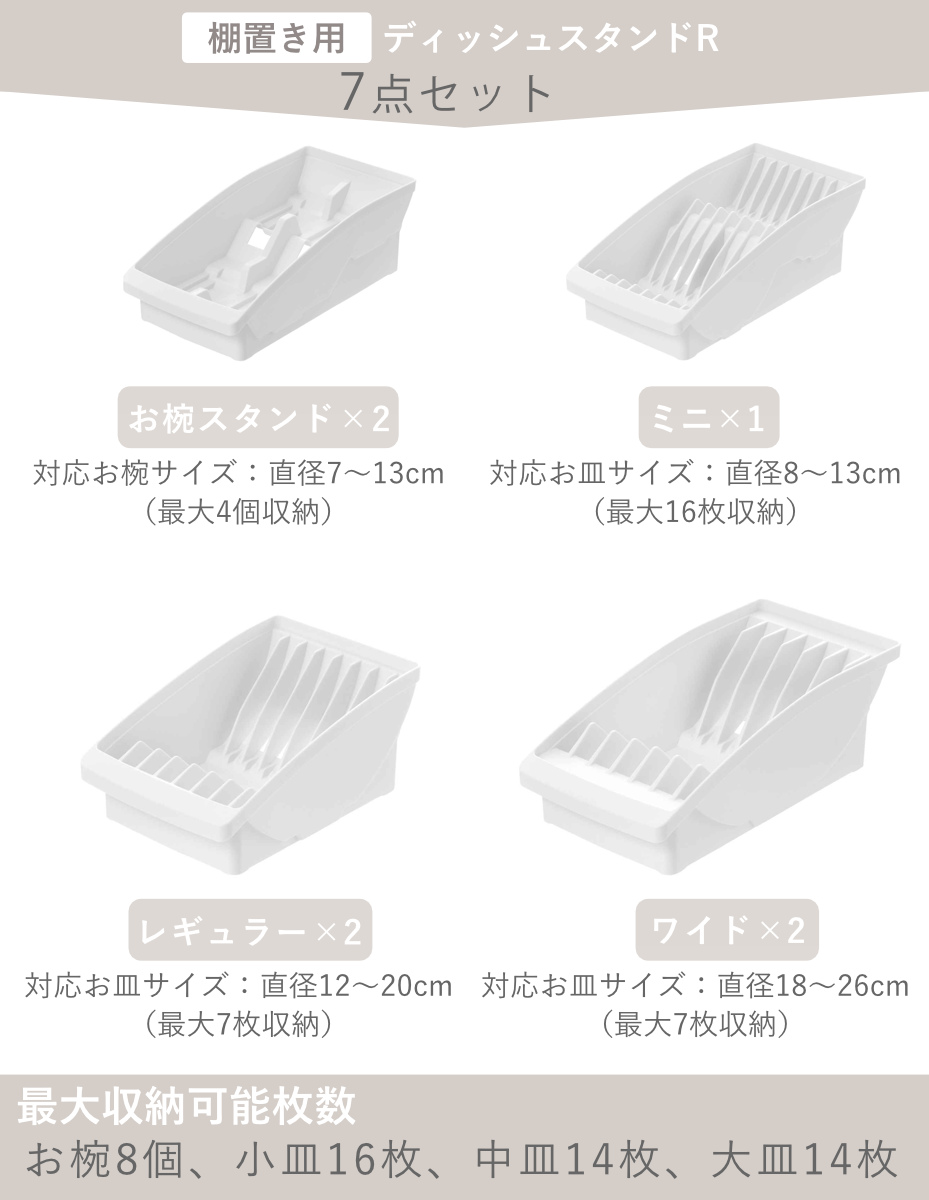 | 内容量 | ディッシュスタンドミニ×1 ディッシュスタンドレギュラー×2 ディッシュスタンドワイド×2 お椀スタンド×2 |
