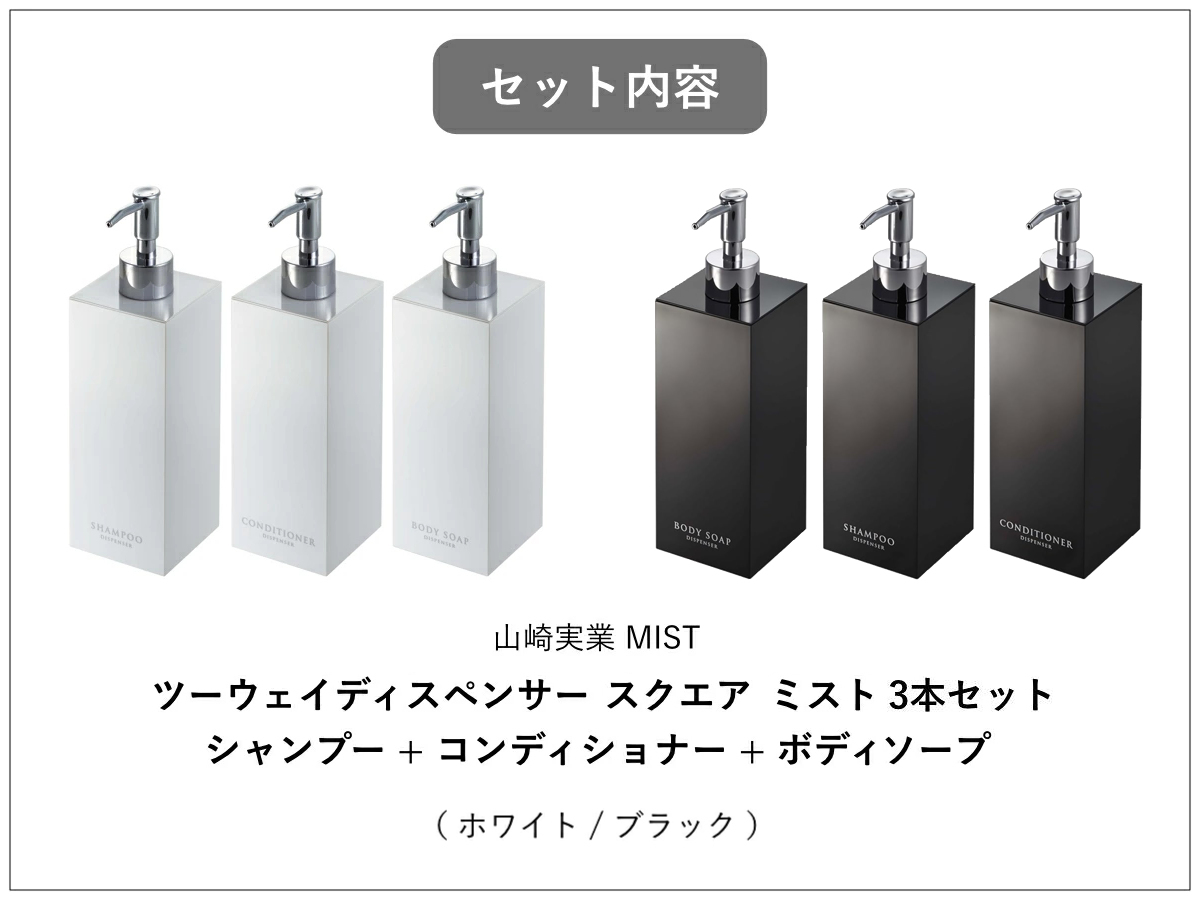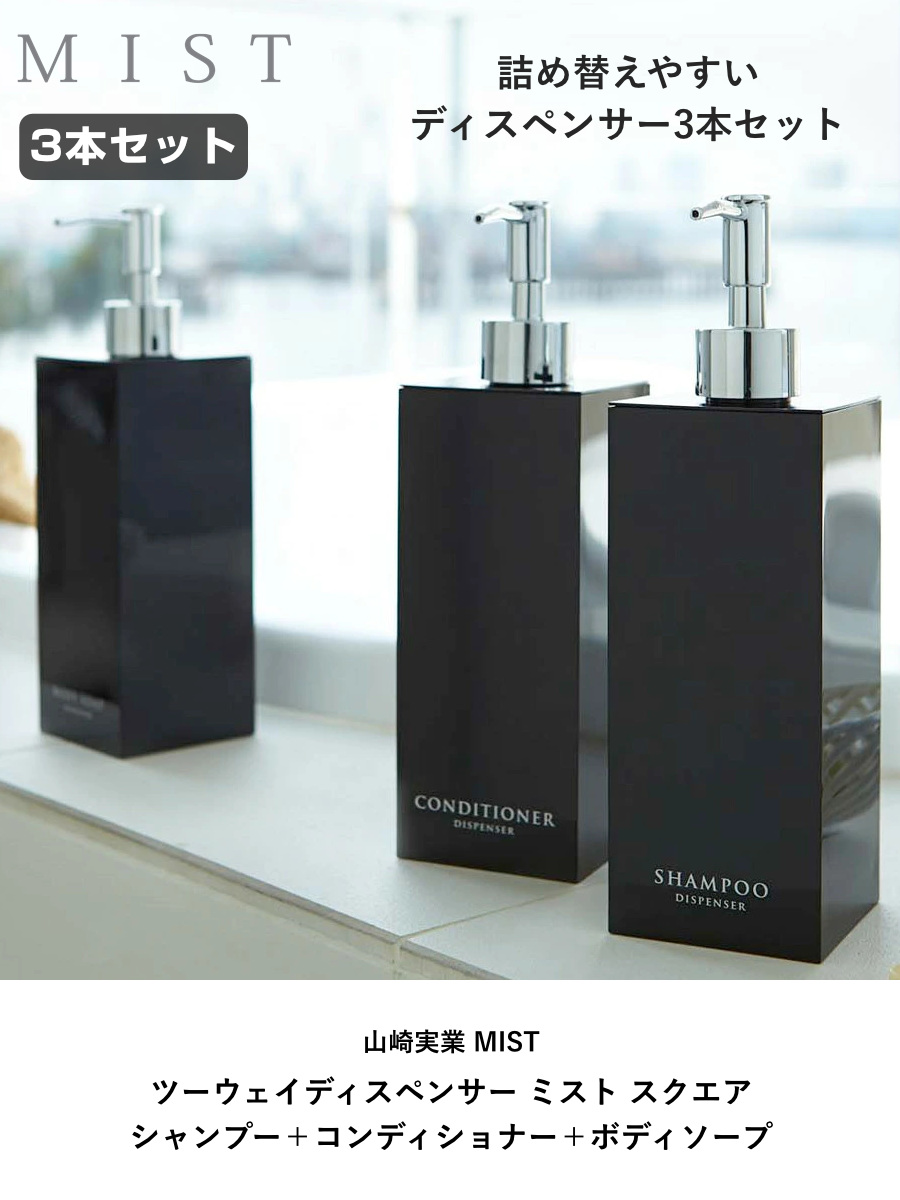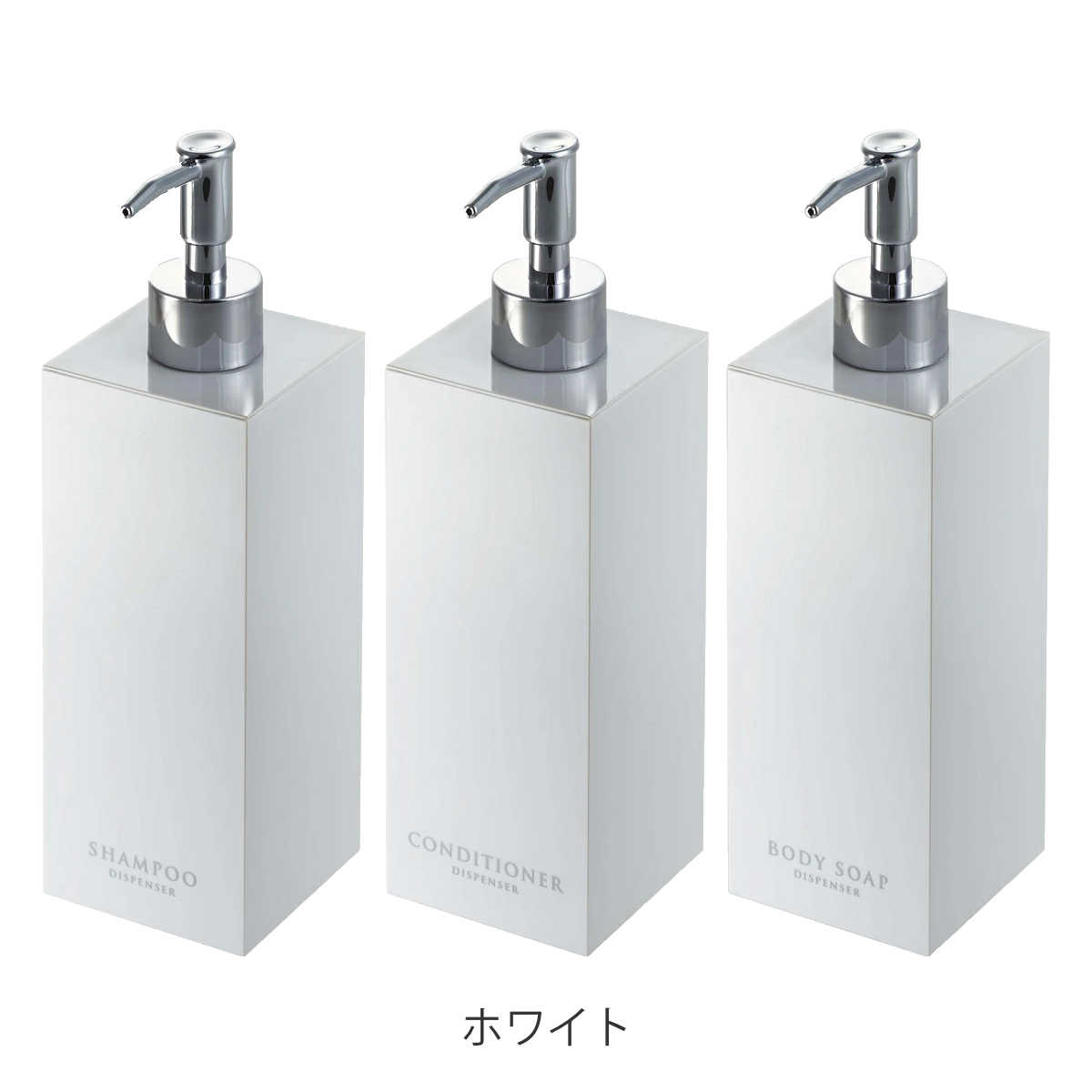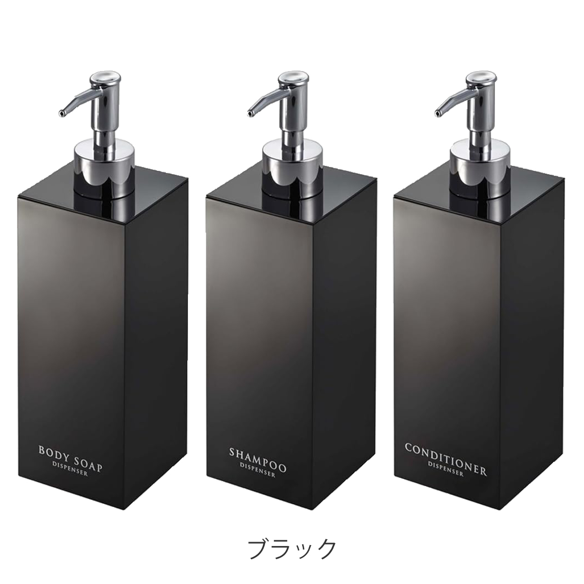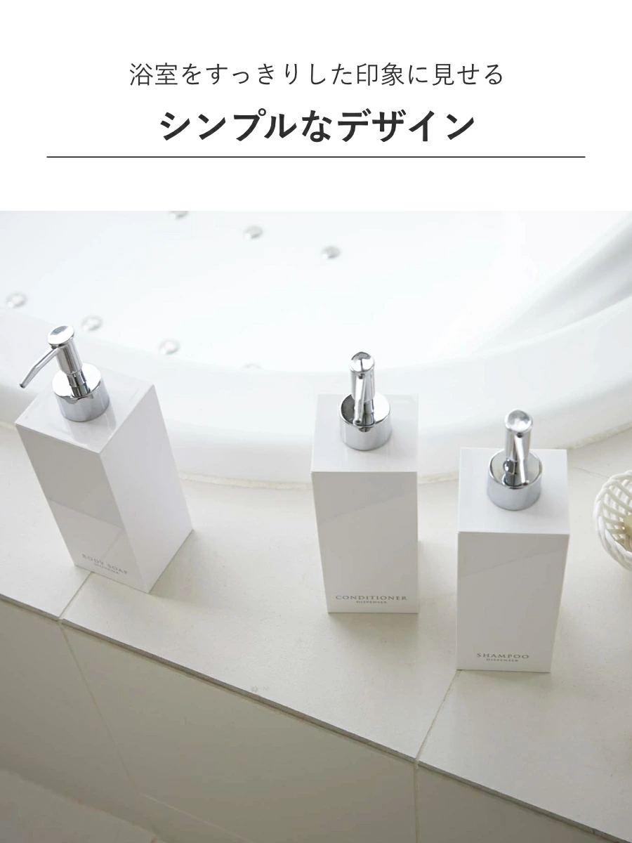 コンパクトな浴室でも場所をとらず省スペースに置けるスクエア形状のディスペンサーボトル3点セットです。光沢のある美しいデザインですっきりとした浴室を演出できます。