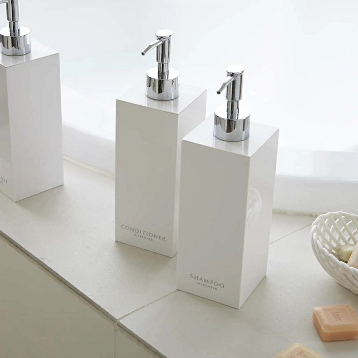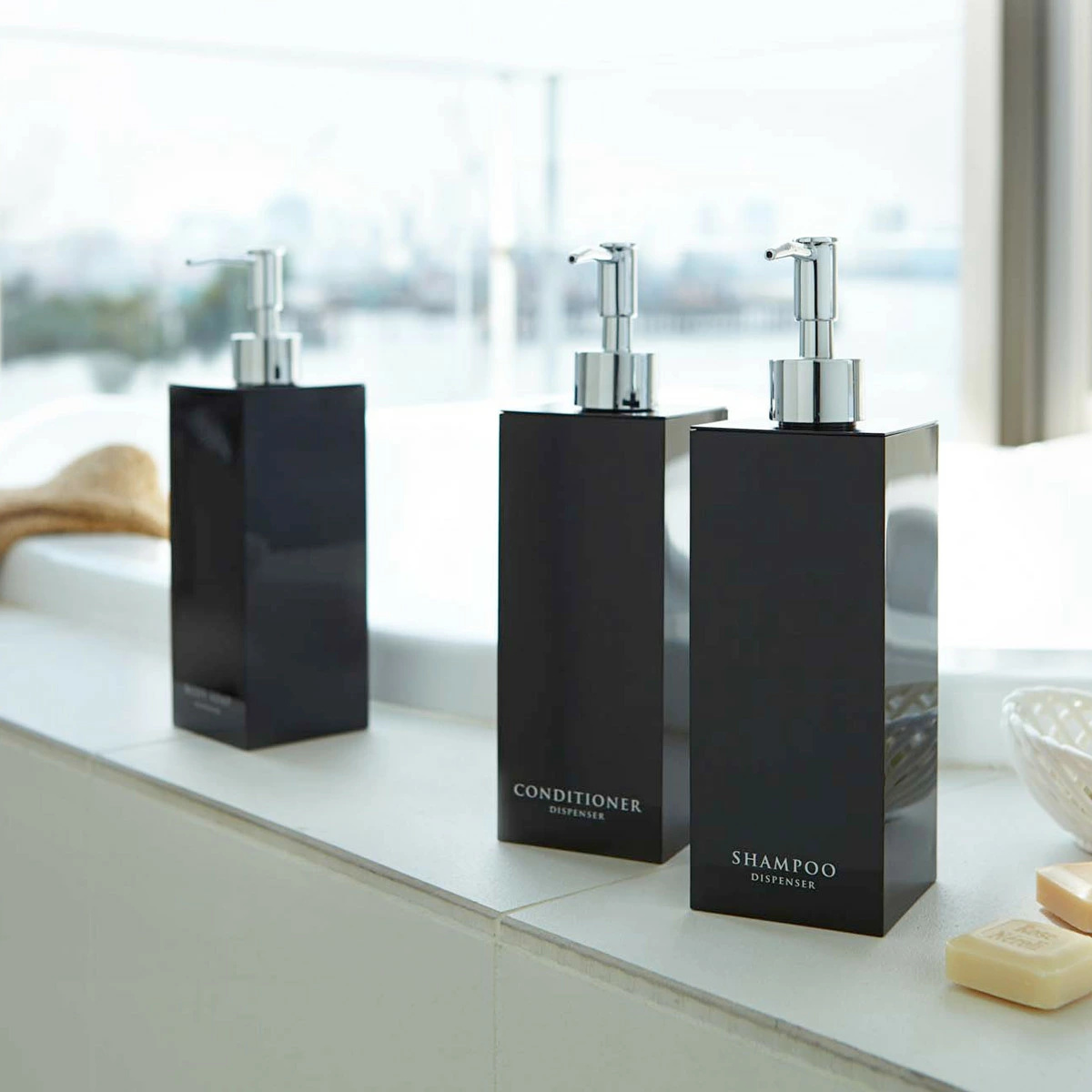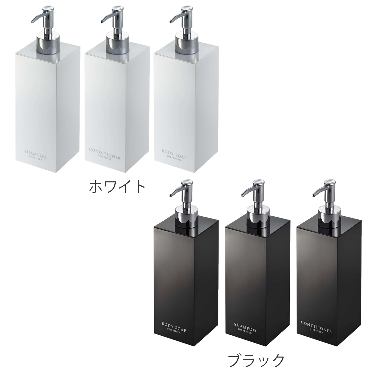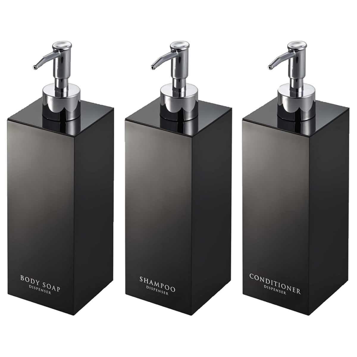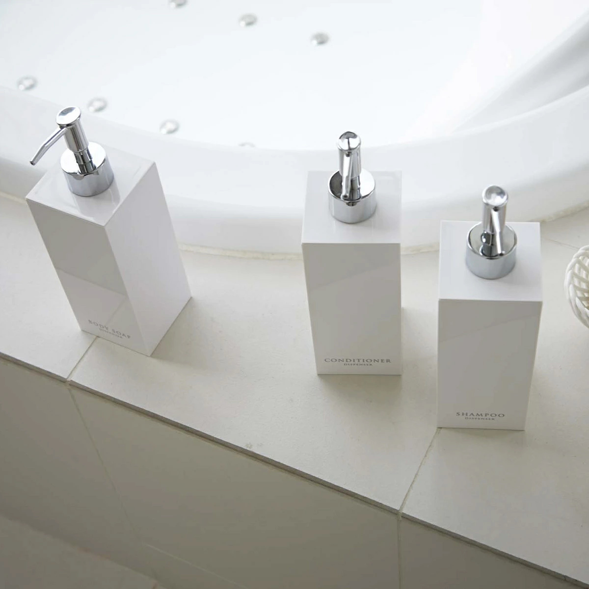 コンパクトな浴室でも場所をとらず省スペースに置けるスクエア形状のディスペンサーボトル3点セットです。光沢のある美しいデザインですっきりとした浴室を演出できます。
