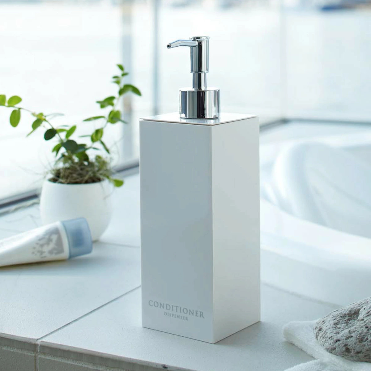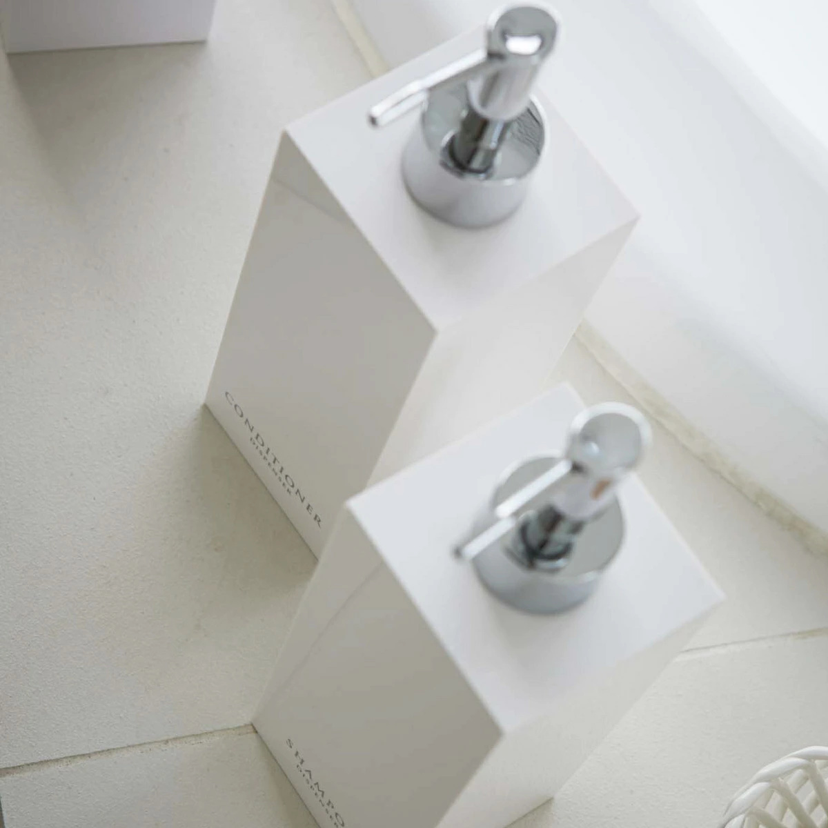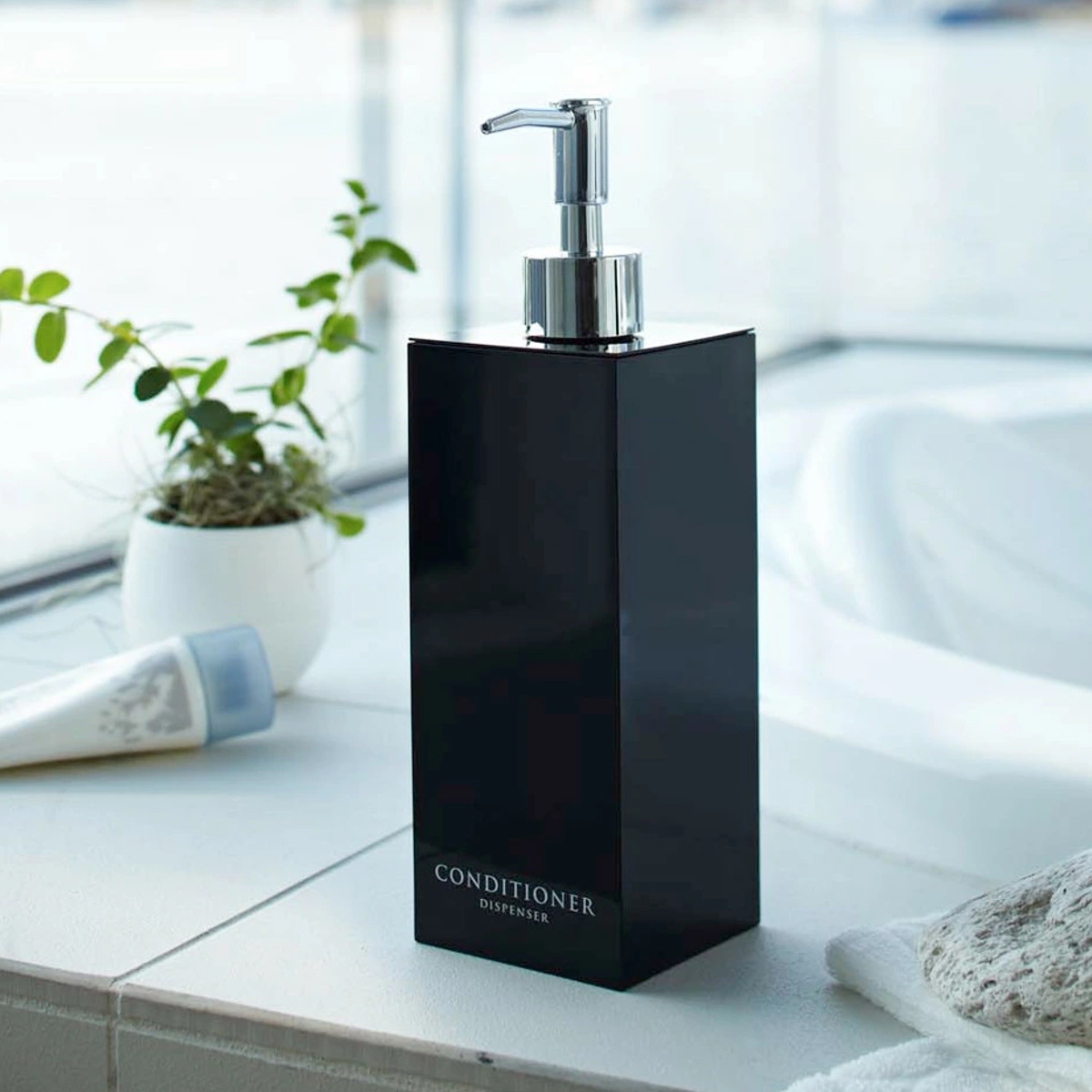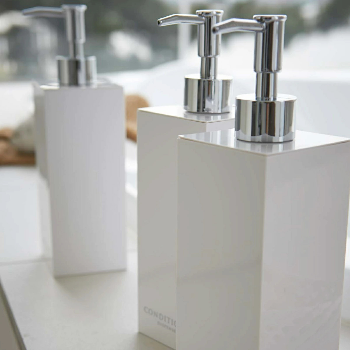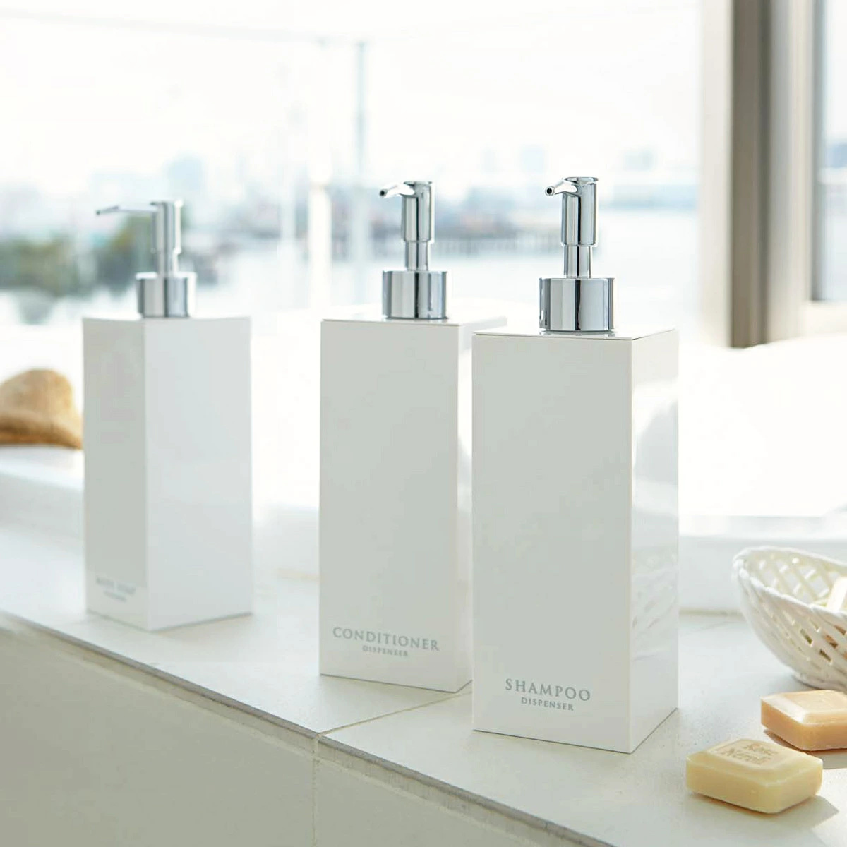 コンパクトな浴室でも場所をとらず省スペースに置けるスクエア形状のディスペンサーボトル3点セットです。光沢のある美しいデザインですっきりとした浴室を演出できます。