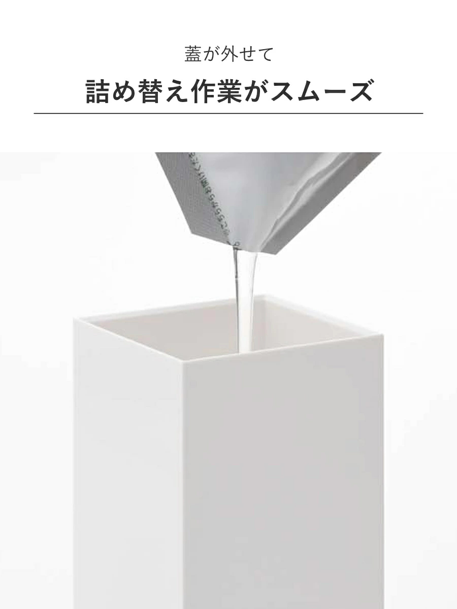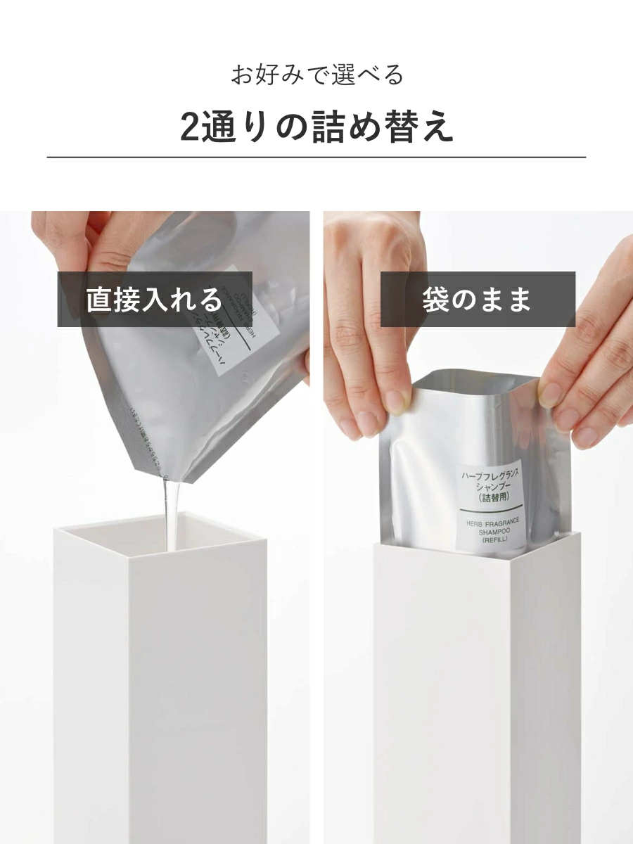 詰め替え用パックを袋ごとそのままボトルに入れることもできます。投入口が広いので詰め替えの際こぼれる心配なく入れることができ、お手入れもしやすいです。