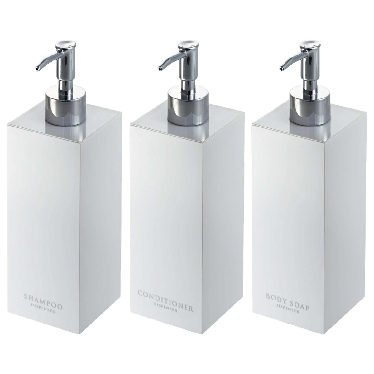 コンパクトな浴室でも場所をとらず省スペースに置けるスクエア形状のディスペンサーボトル3点セットです。光沢のある美しいデザインですっきりとした浴室を演出できます。