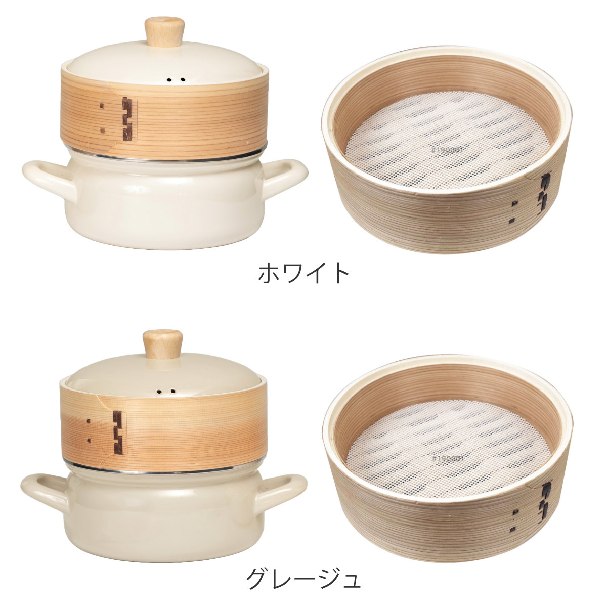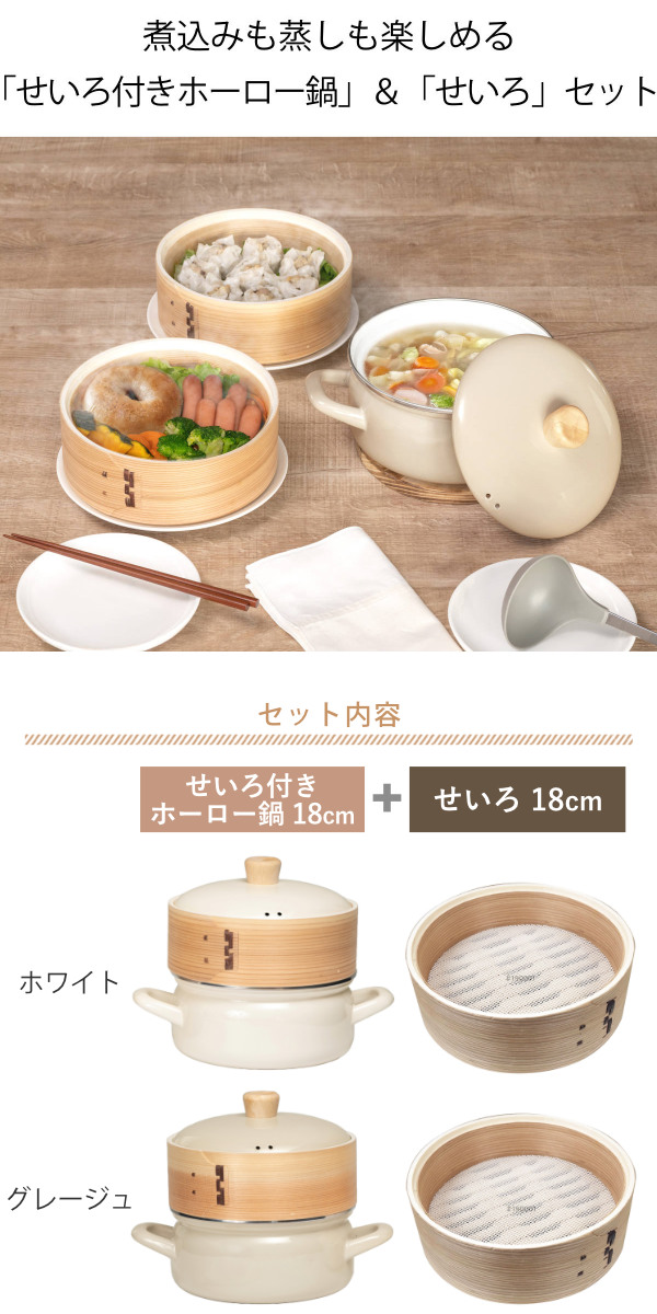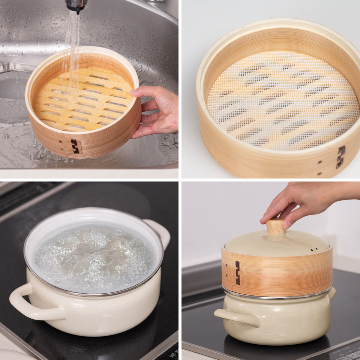 可愛らしいホーロー鍋と、一緒に使えるセイロのセットです。使い方はとっても簡単で、お湯を沸かしたお鍋にセイロをセットするだけでOK。セイロ用の台を別で購入する必要が無いので、セイロデビューの方でもこれ1台あればすぐに調理を始められます。