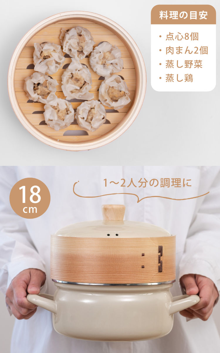 ころんとした見た目の、小ぶりで使いやすい18cmサイズです。蒸し野菜や蒸し鶏などメインの料理にも使えるので、一人暮らしの方はもちろん、ご家族がいる家庭にもおすすめです。