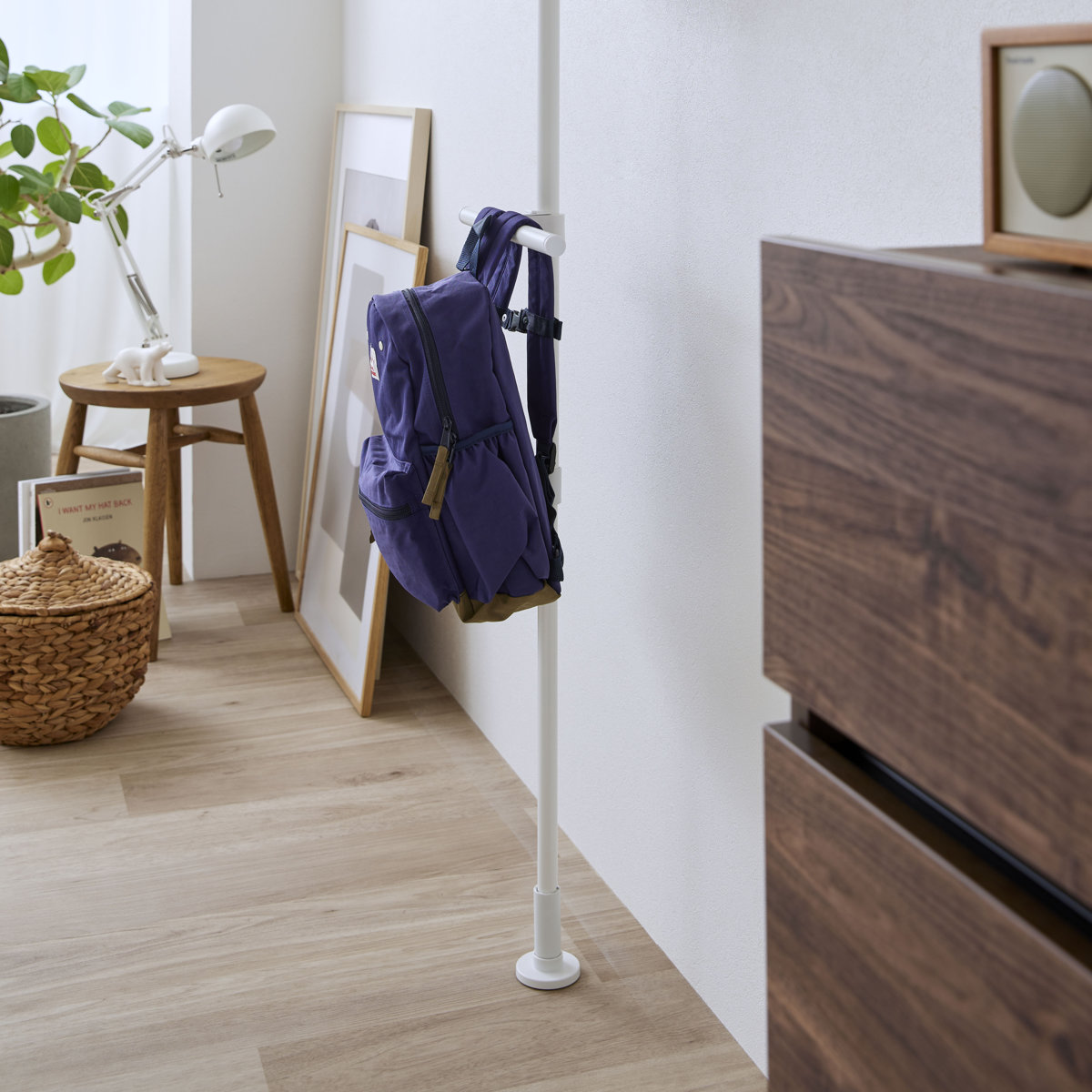 リュックを掛けられる「まっすぐバー」。玄関や子ども部屋の収納として最適です。ハンガーやスプレーを掛けるのもおすすめ。