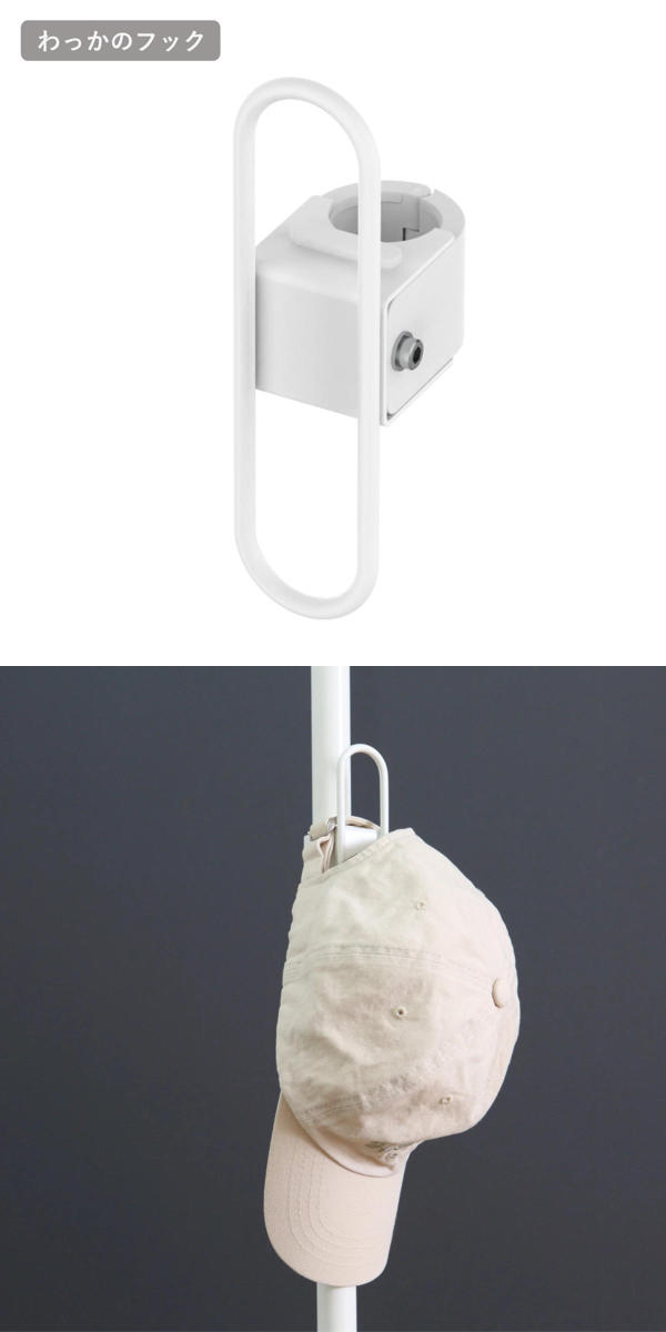 帽子やバッグを掛けられる「わっかのフック」。下の部分にハンガーを引っ掛けることもできます。
