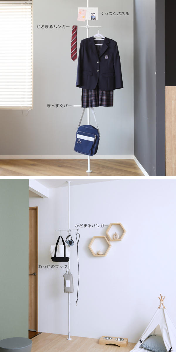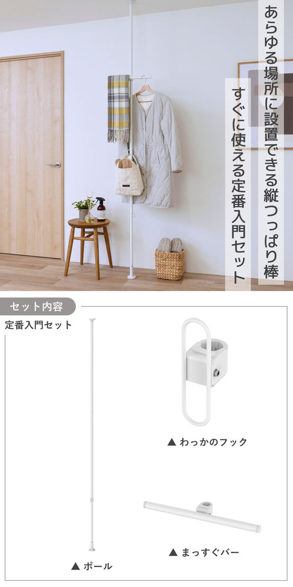 ![]() 定番入門セット (ポール、わっかのフック、まっすぐバー) 【▲このページの商品】 | ![]() リュックを浮かせる収納 (ポール、まっすぐバー×2) | ![]() スリムなちょい置きセット (ポール、わっかのフック、かくせるテーブル) |