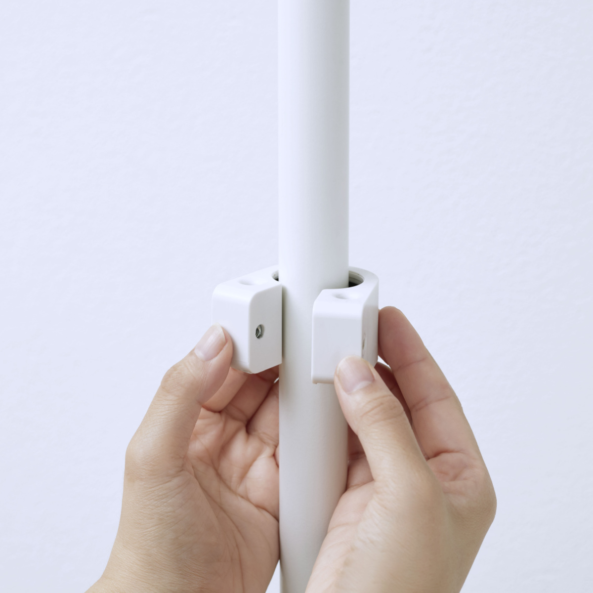 天井と床に突っ張るだけで簡単に設置できる縦つっぱり棒「tatecco(タテッコ)」。基本の突っ張りポールと使いやすい定番のパーツをセットにしました。届いたらすぐに設置して、暮らしに「ちょうどいい」収納を作ることができます。お部屋に馴染みやすいマットなホワイトカラーのシンプルなデザインが魅力のひとつです。