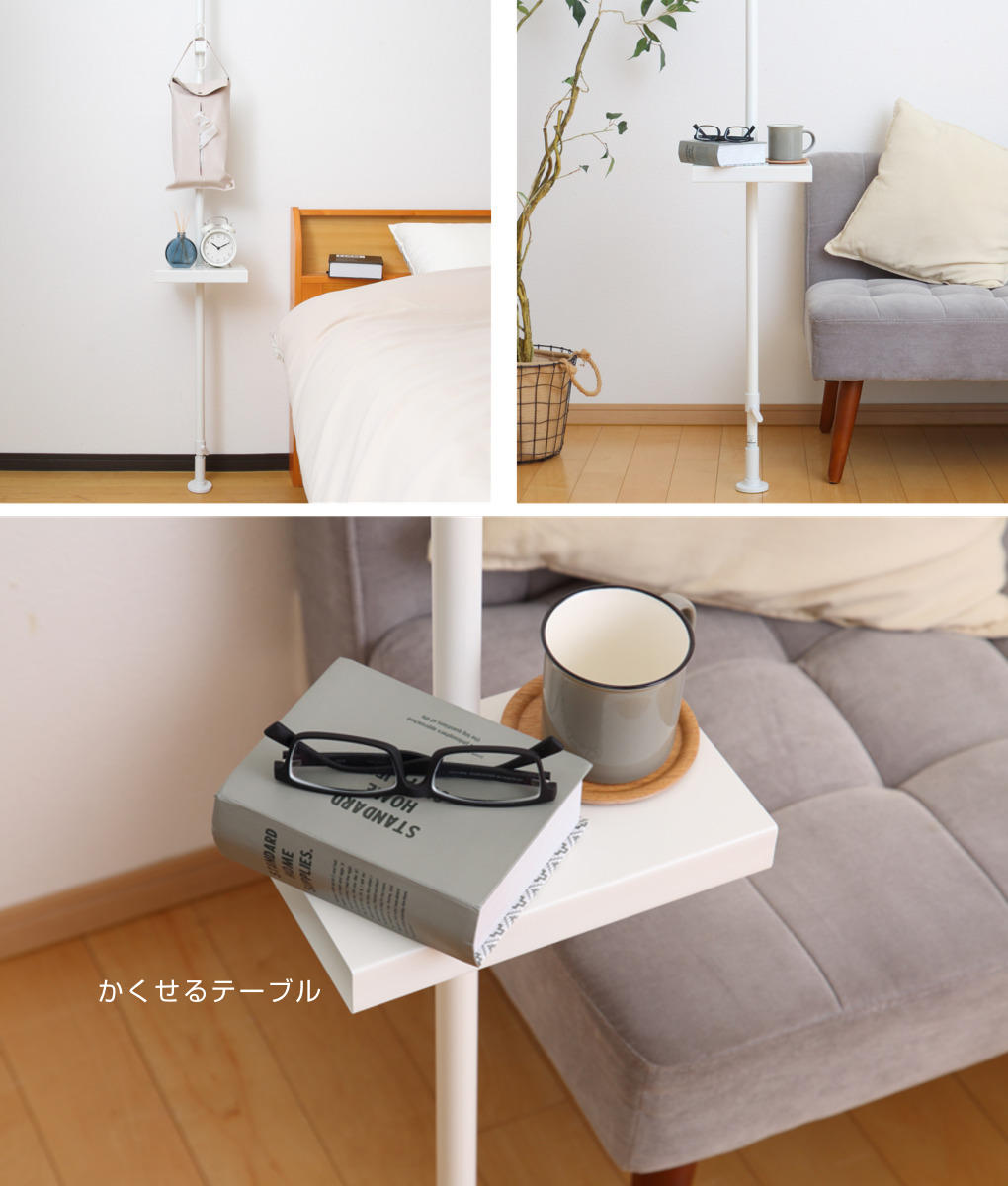 「かくせるテーブル」は、ベッドやソファサイドに設置してマグカップや本を置くテーブルに。家具の買い替えで高さが変わっても、その都度合わせて設定ができます。
