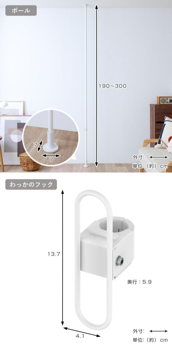 | サイズ | 【ポール】 約 幅7×奥行7×高さ190~300(cm) ポール直径:2.5(cm) 【わっかのフック】 約 幅4.1×奥行5.9×高さ13.7(cm) 【まっすぐバー】 約 幅36×奥行7.6×高さ3.9(cm) |
