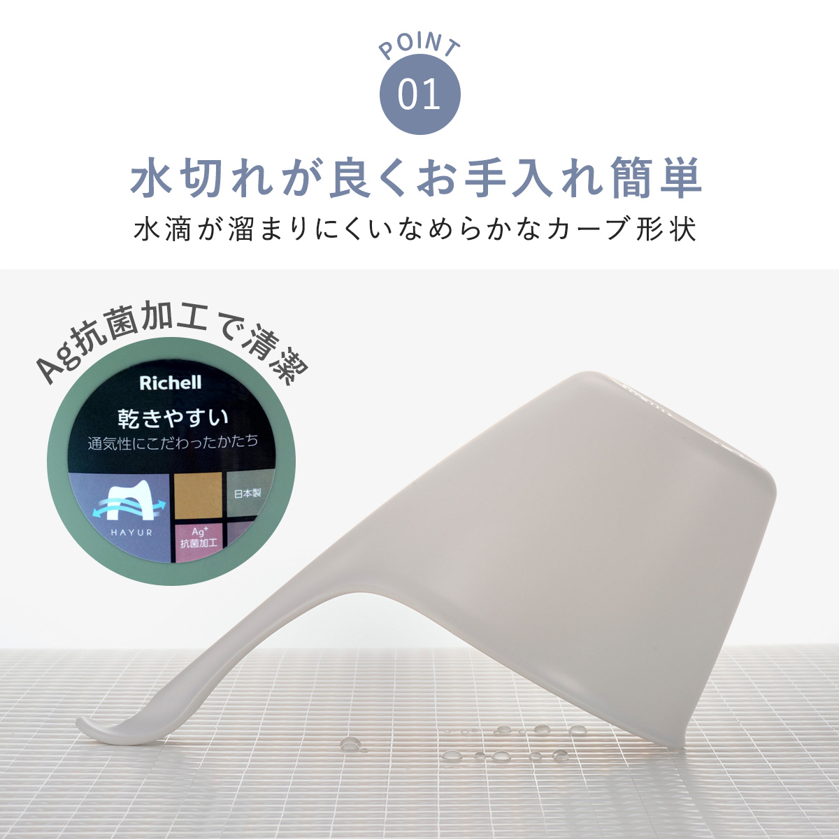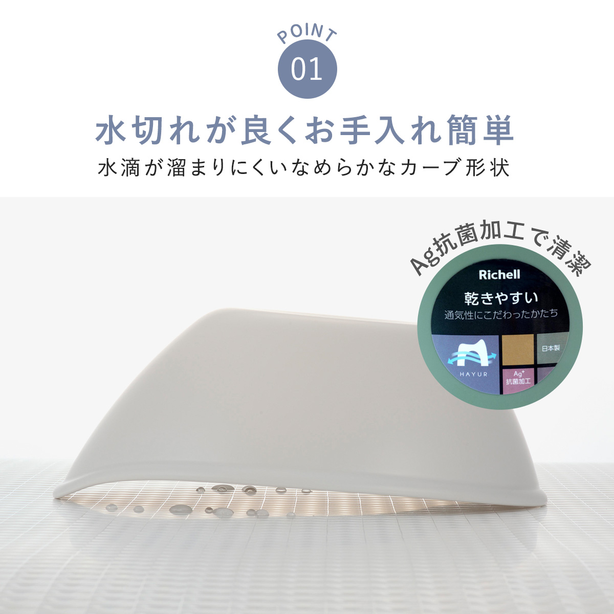継ぎ目のない滑らかなカーブ形状にすることで、水滴や汚れがが溜まりにくくなっています。水切れも通気性も良いので、清潔に乾燥させることが出来ます。さらに抗菌効果のある銀イオン配合で、ヌルヌルや臭いの発生が抑えられます。