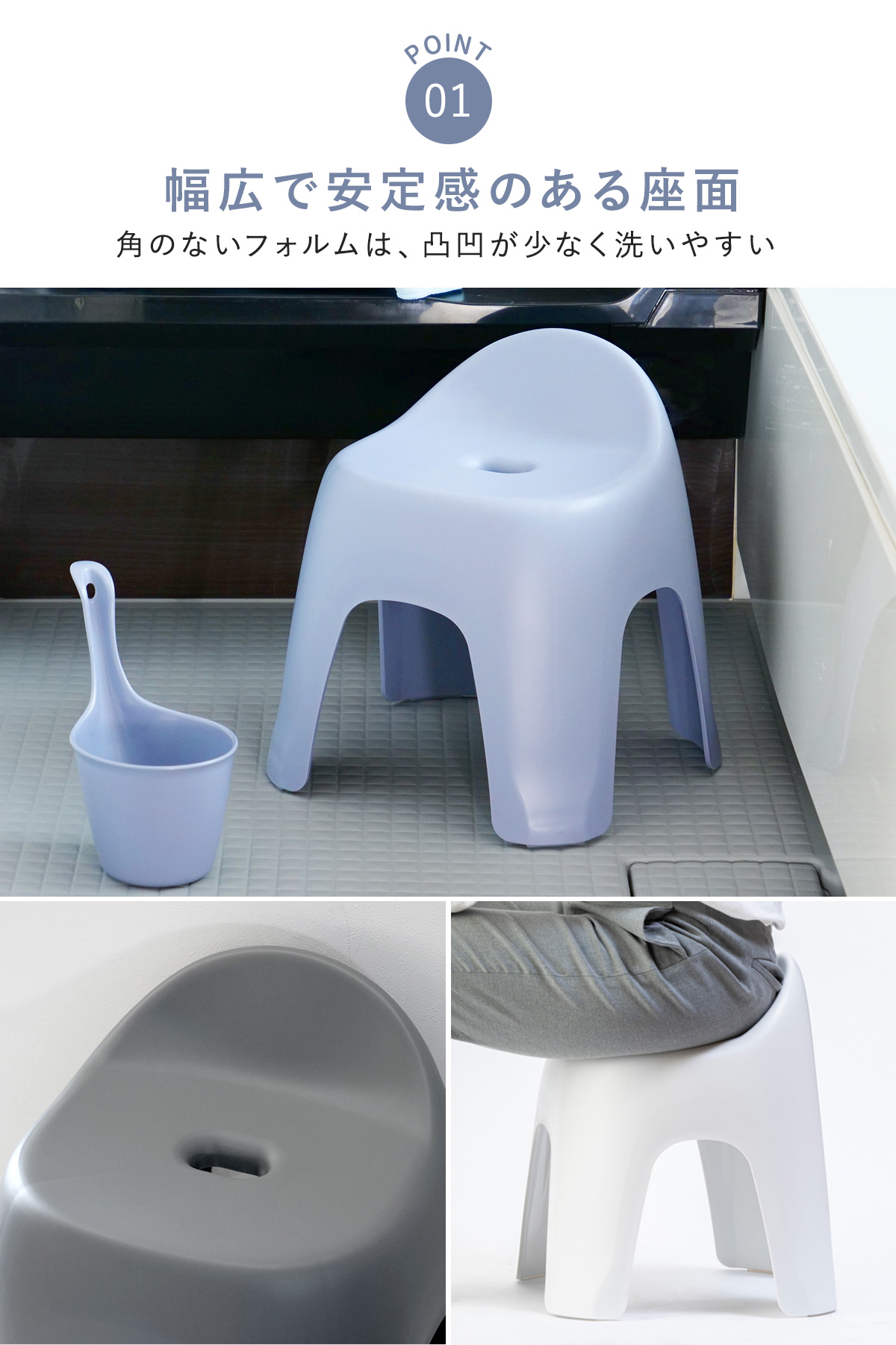 おしりに優しくフィットする安定感のある幅広の座面で、女性はもちろん男性が座ってもしっかりと安定します。さらっとした表面と凸凹の少ない設計で、快適な座り心地とお手入れのしやすさを両立しています。
