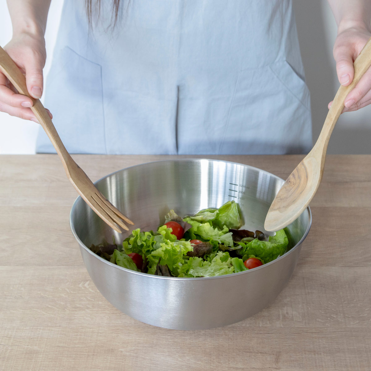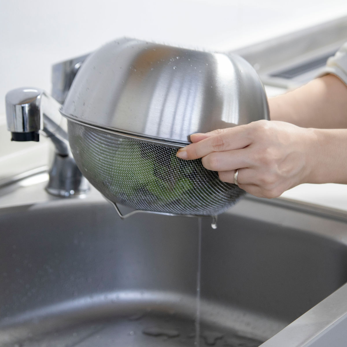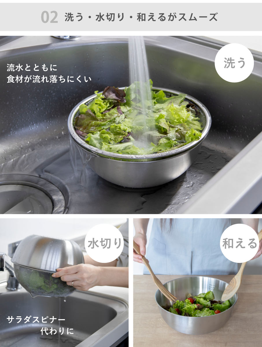 食材を水にさらす際は、ボウルとザルを重ねて使うことで、食材が流れ落ちにくく安心です。ボウルとザルを組み合わせれば、サラダスピナーのように水切りできます。