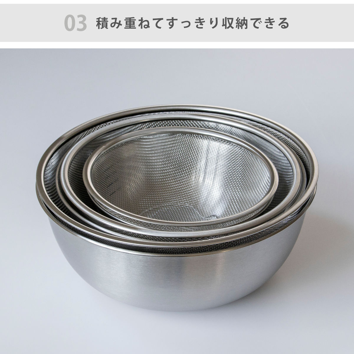 ボウルとザルを重ねて収納できるため、すっきりと片付きます。置き場所に困らず、取り出しやすい場所に置けます。毎日使いたくなる使い勝手の良さです。