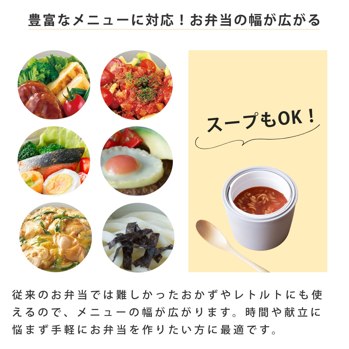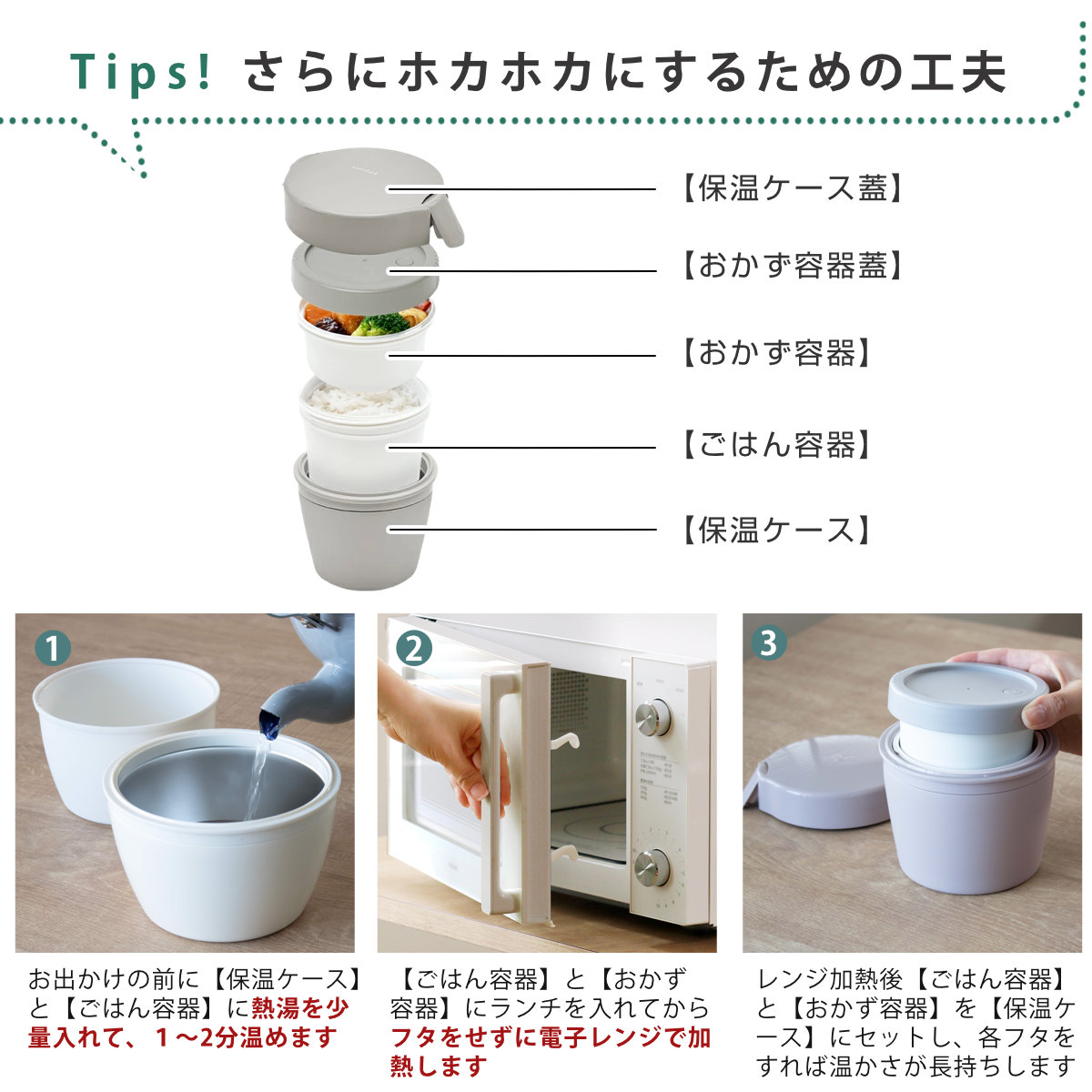 | 備考 | ご飯容量:お茶碗約1.2杯分 ご飯容器、おかず容器は蓋を外して電子レンジ使用可 保温ケース以外は食洗機使用可 |