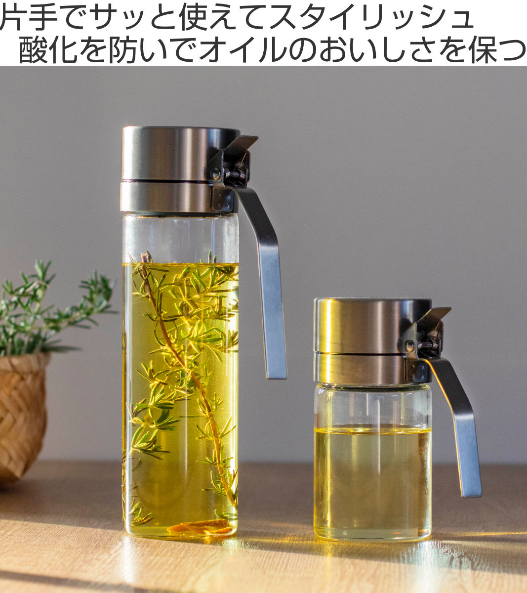 オイルの大敵である酸化を防いでくれる、ガラス製オイルボトルです。使い勝手抜群のスタイリッシュなデザインは、キッチンのみならず食卓でもデイリーに活躍。オイルの鮮度を保ち、毎日のおいしい食事をアシストします。