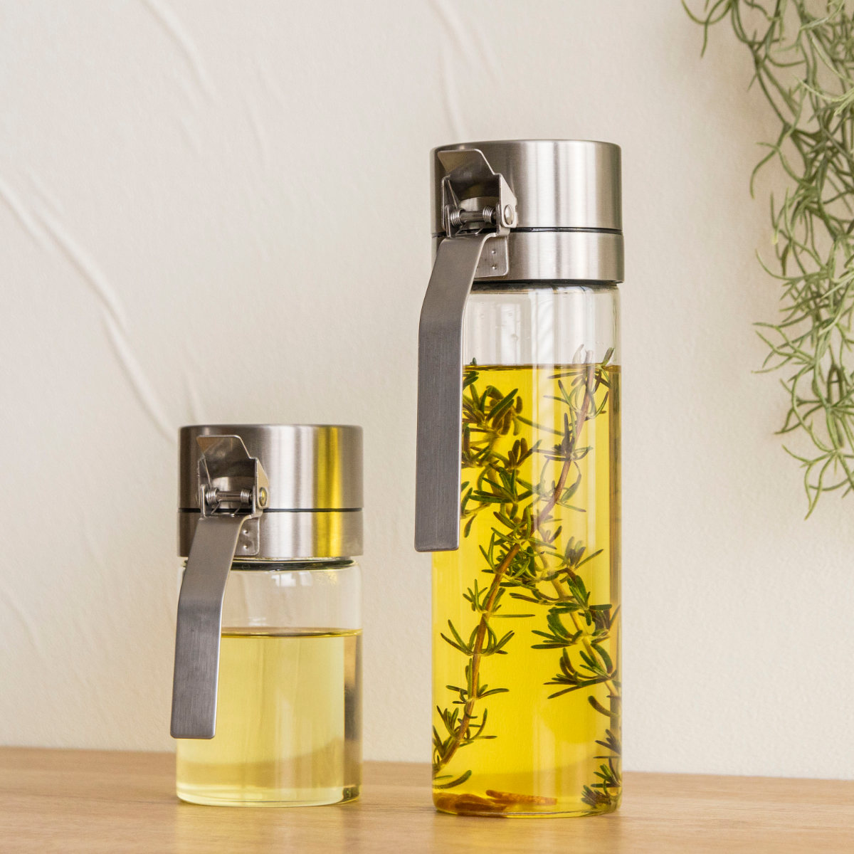 フレーバーオイルやドレッシングを入れて食卓でも活躍。飽きのこないシンプルなデザインは、様々なテイストと相性がよく、数種類出しておいもテーブルに圧迫感を与えません。冷蔵庫保管もOK。