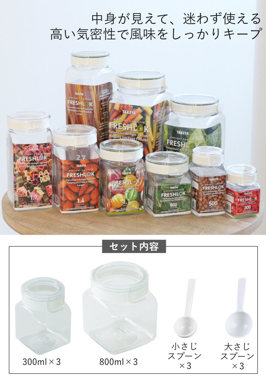 | 内容量 | 【セット内容】 300ml×3個 800ml×3個 小さじスプーン×3個 大さじスプーン×3個 |