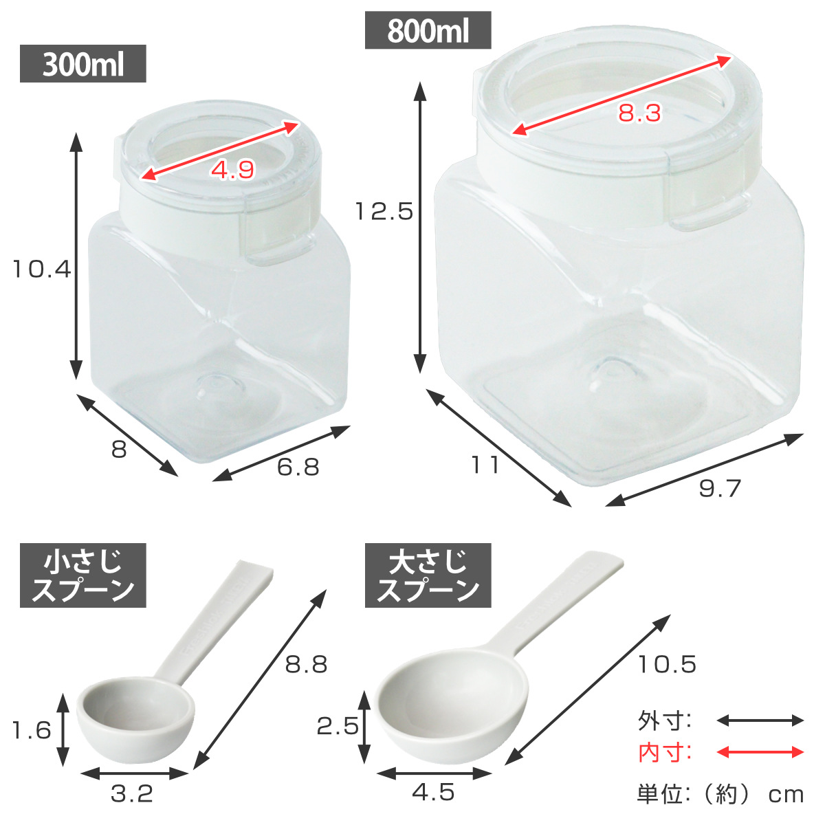 | サイズ | 300ml:約 幅6.8×奥行8×高さ10.4(cm) 800ml:約 幅9.7×奥行11×高さ12.5(cm) 小さじスプーン:約 幅3.2×奥行8.8×高さ1.6(cm) 大さじスプーン:約 幅4.5×奥行10.5×高さ2.5(cm) |