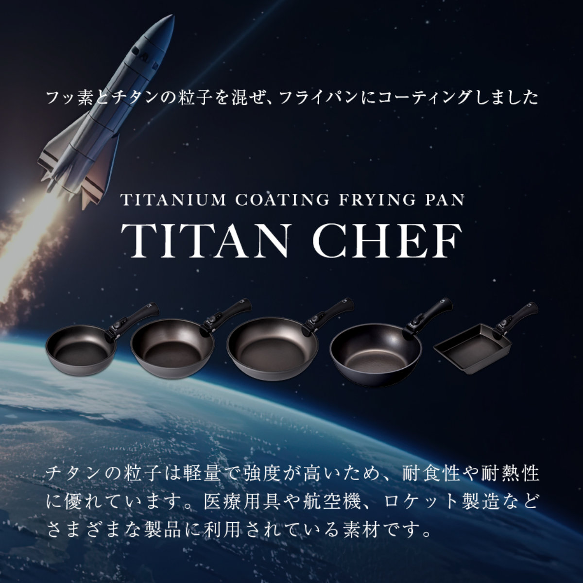 チタンシェフシリーズのフライパンには、医療機器やロケット部品などにも用いられるチタン粒子配合コーティングを施しています。軽量でありながら高い強度を誇り、耐食性・耐熱性にも優れているため、安心して長く使用できます。食洗機にも対応しています。