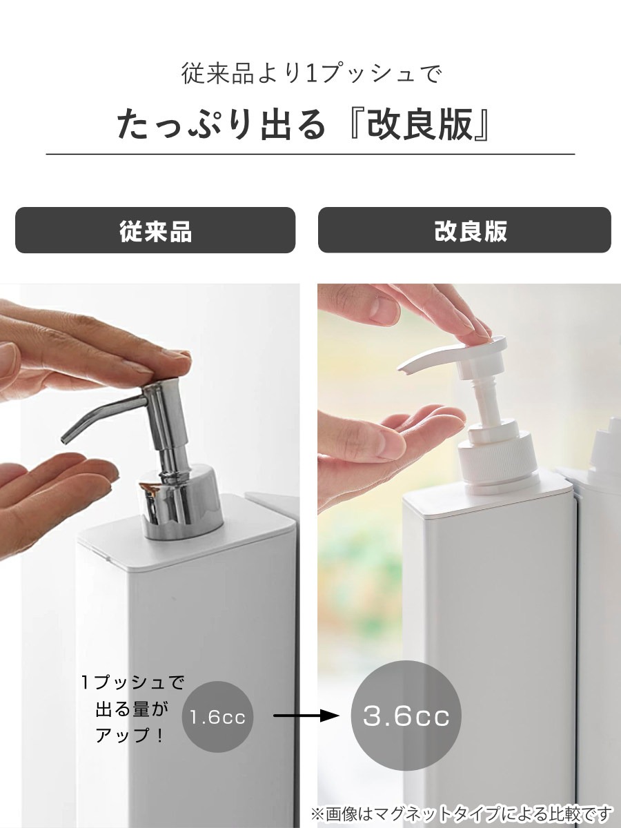 従来品に比べて、1プッシュで出る量が1.6cc→3.6ccにアップ。一度にしっかり出したい方におすすめです。底面が傾斜になっているので残量が少なくなっても最後まで快適に使えます。