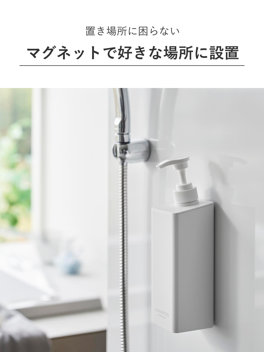マグネットがつく壁面ならどこでも取り付けできる、ディスペンサーボトルです。ラックなど置くスペースがなくても置き場所に困らず設置できます。浮かせて設置できるので、底のヌメりも気にならず衛生的です。