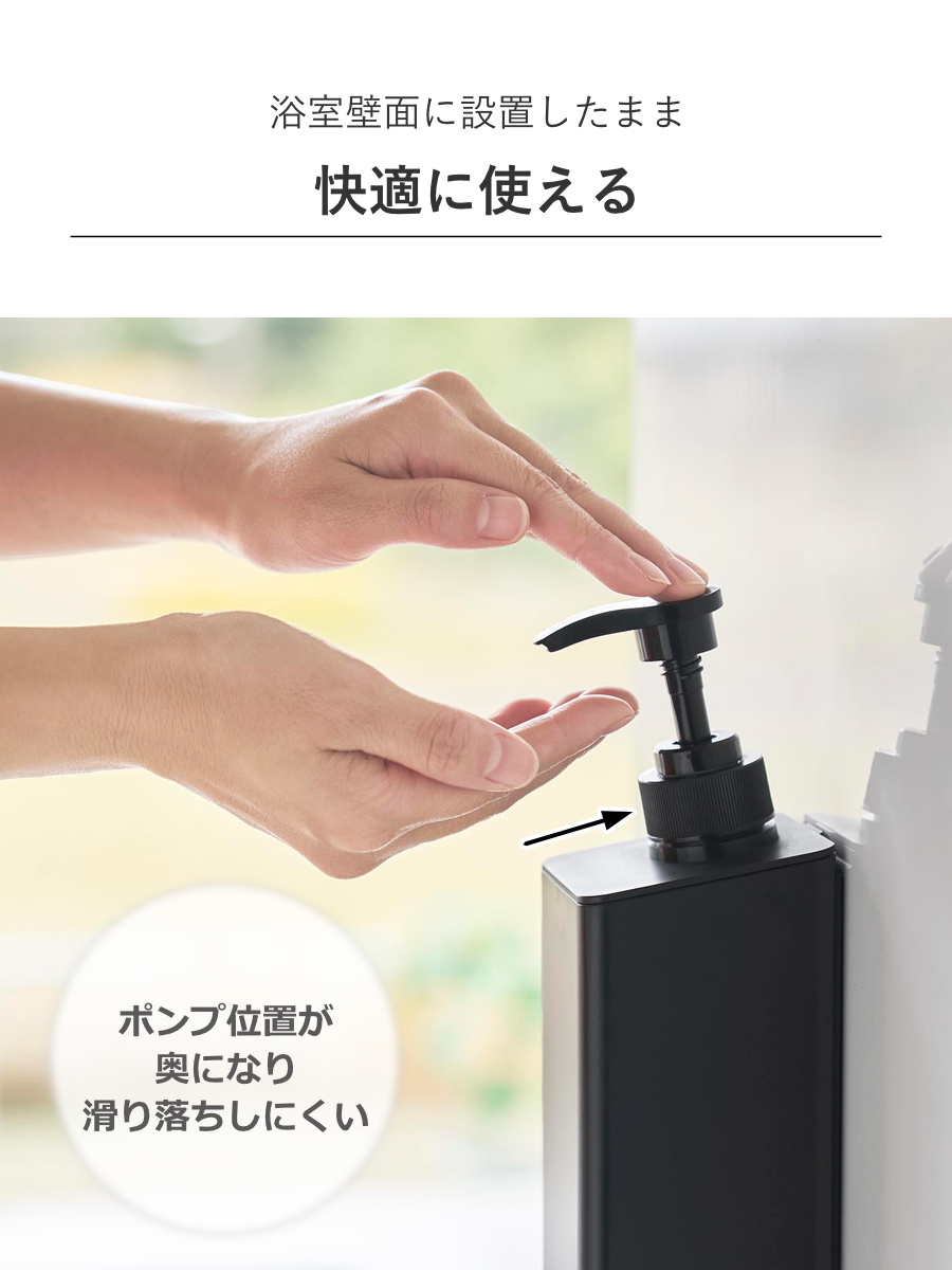 ポンプ部が斜めになっていることで押す力が分散され、浴室壁面に設置したままポンプを押して液体を出すことができます。ポンプ位置を奥にすることで従来品よりも滑り落ちが改善され、より快適に使いやすくなりました。