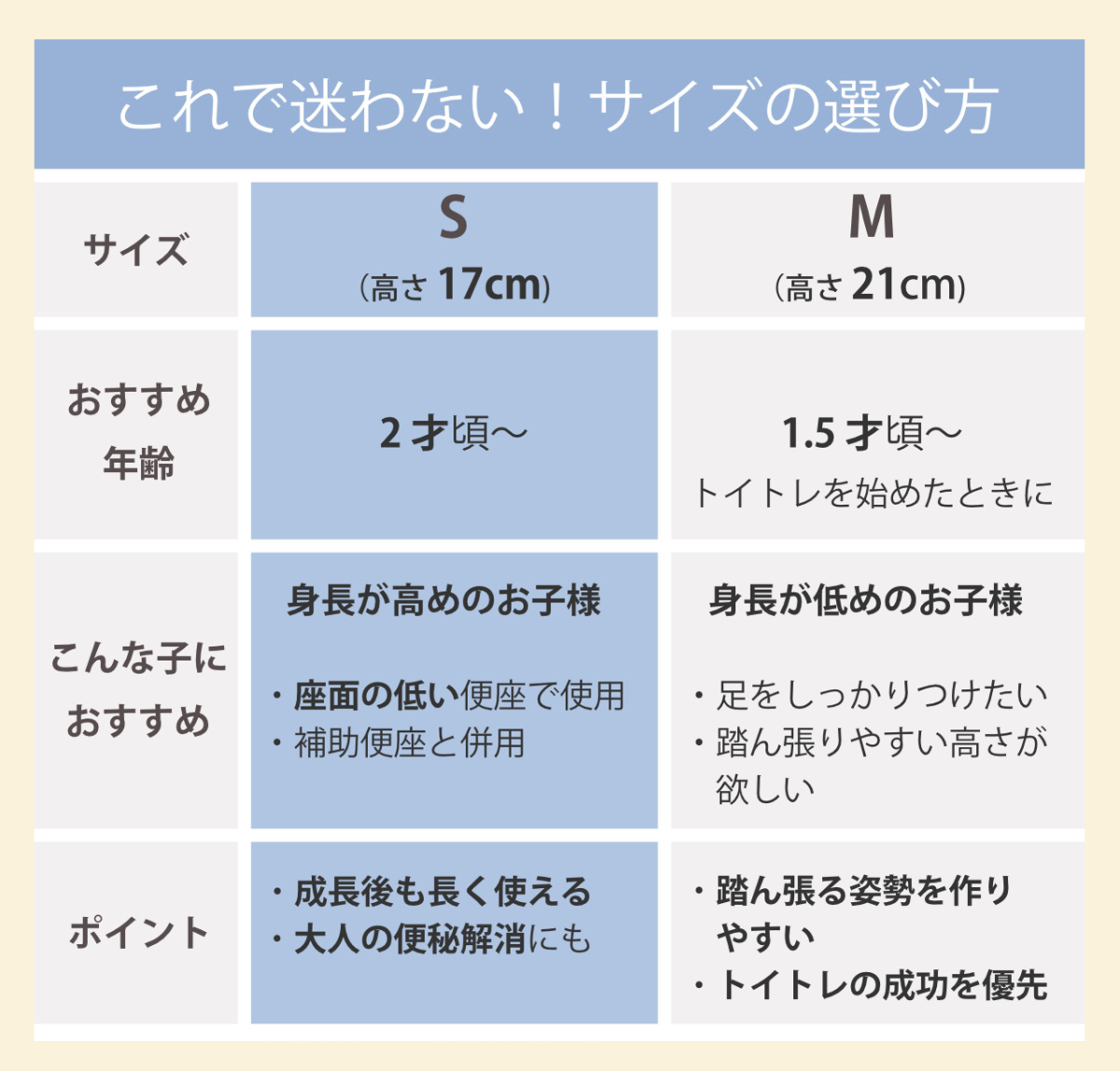 | 対象年齢 | 【補助便座】 グリップ付:1歳6カ月頃~4歳頃 グリップなし:2歳頃~4歳頃 【トイレスムーズステップM】 1歳6カ月頃~ |