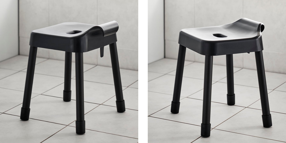 座面高40cmのハイタイプで、立ち座りがしやすく身体への負担を軽減します。浴室内のランドリーパイプやタオルバー、浴室扉のハンドルなどに引っ掛けられるフックが付いているので、浮かせて収納できます。背面には、シャワーフックにも掛けられるプレート付きです。