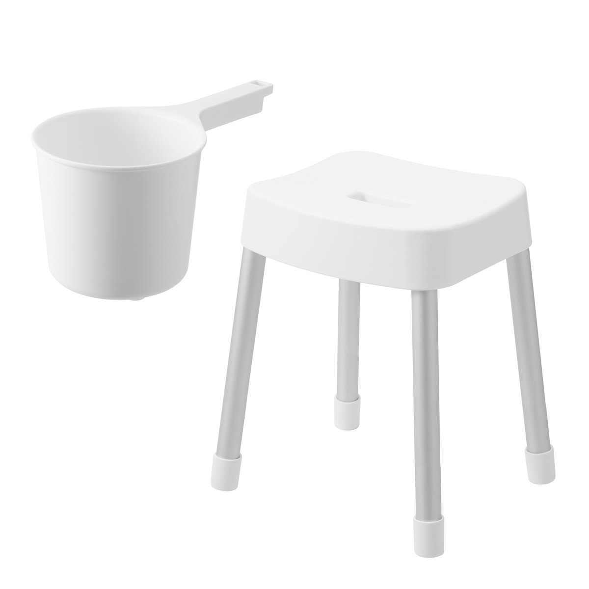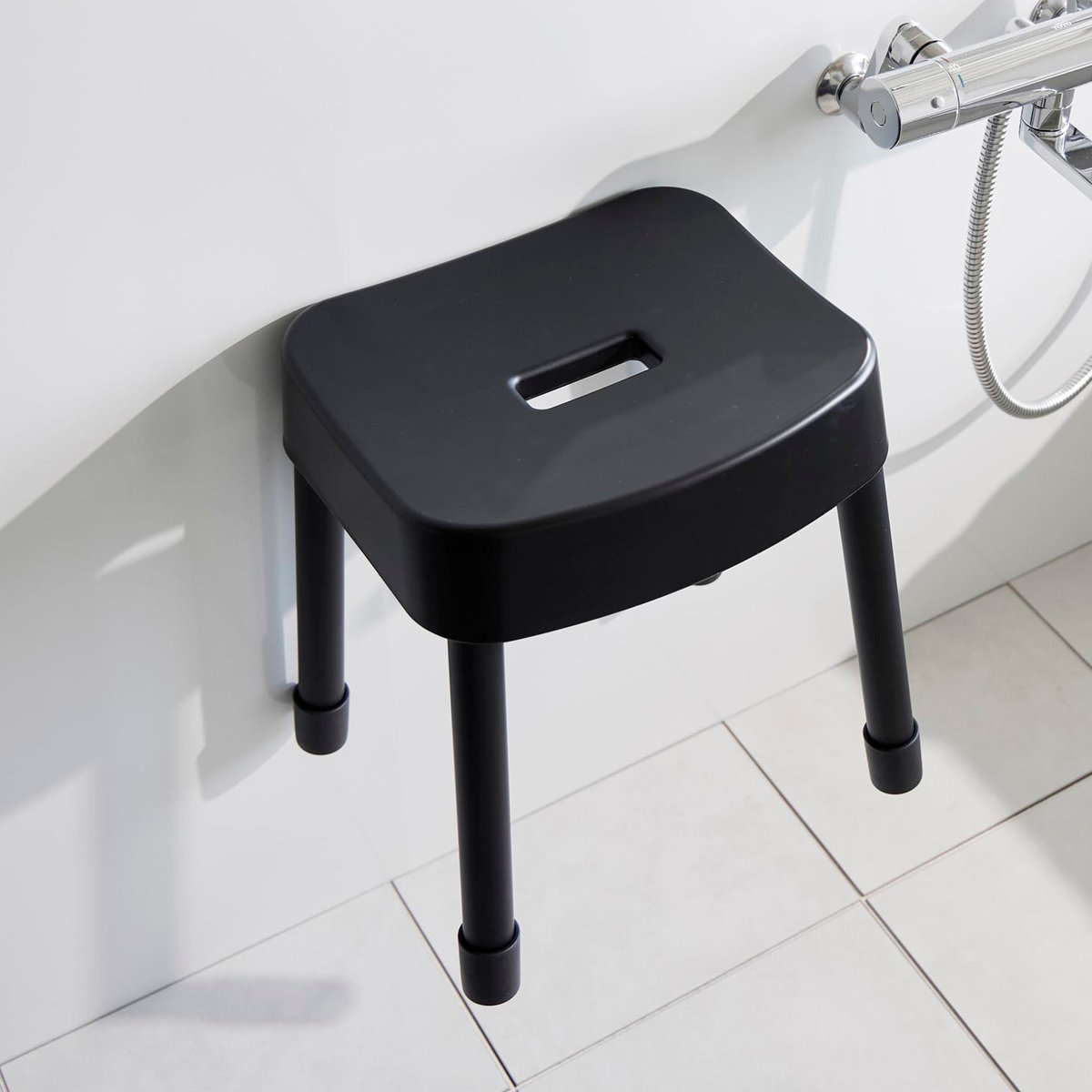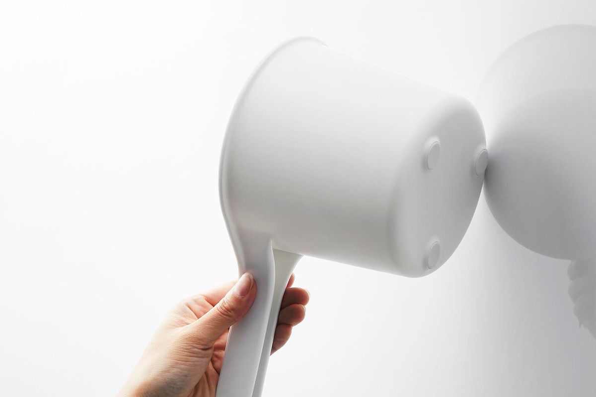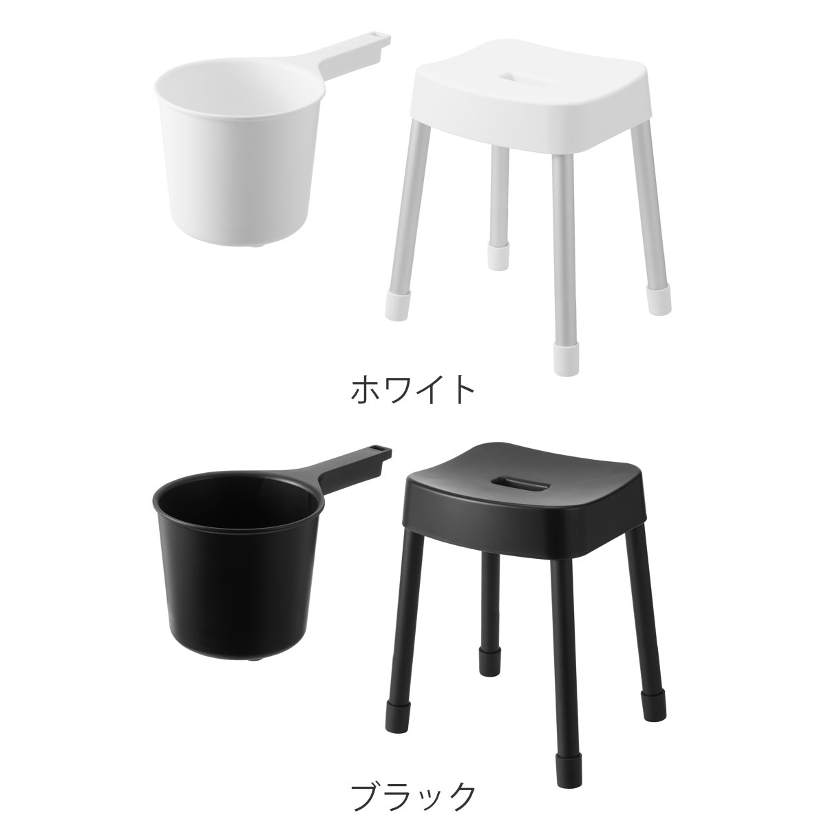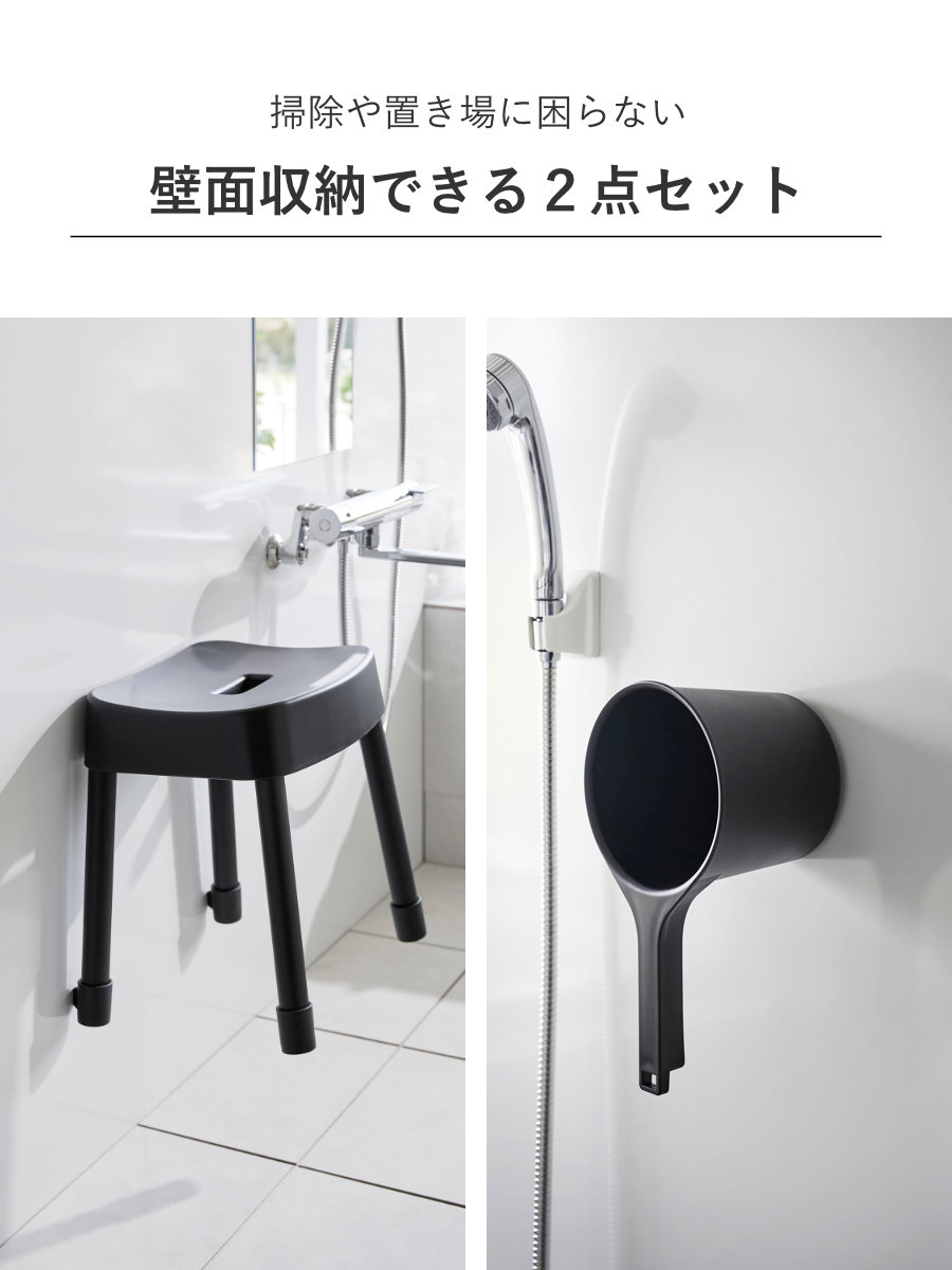 浴室の壁面にマグネットでピタっとくっつく「風呂イス」と浴室のバーや扉に引っ掛けられる「手おけ」の2点セットです。浴室の床に直接置かないので、ヌメリや水垢が付くのを防ぎ、清潔に収納できてお掃除もラクラクです。シンプルなデザインで、お風呂のどこに置いても馴染みます。