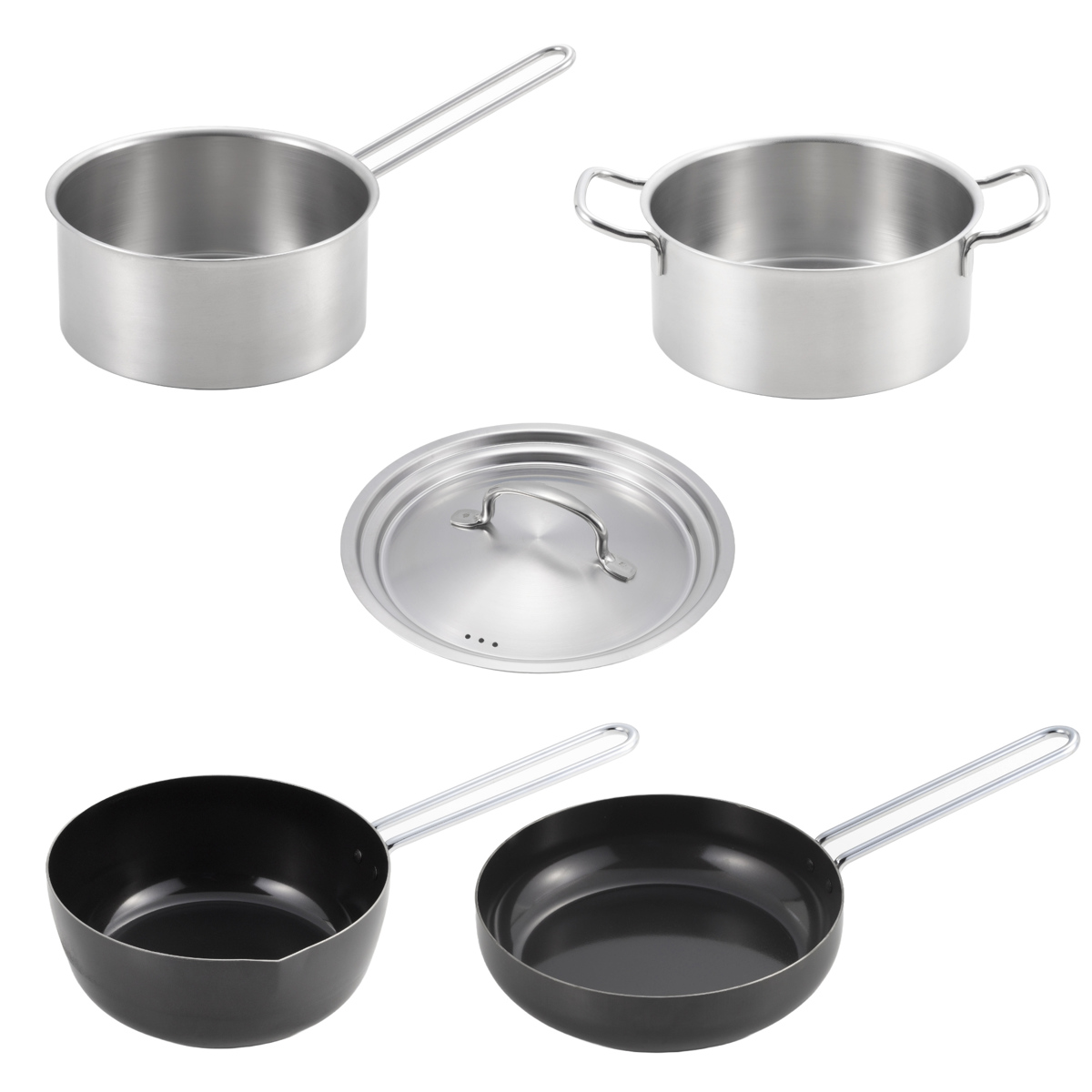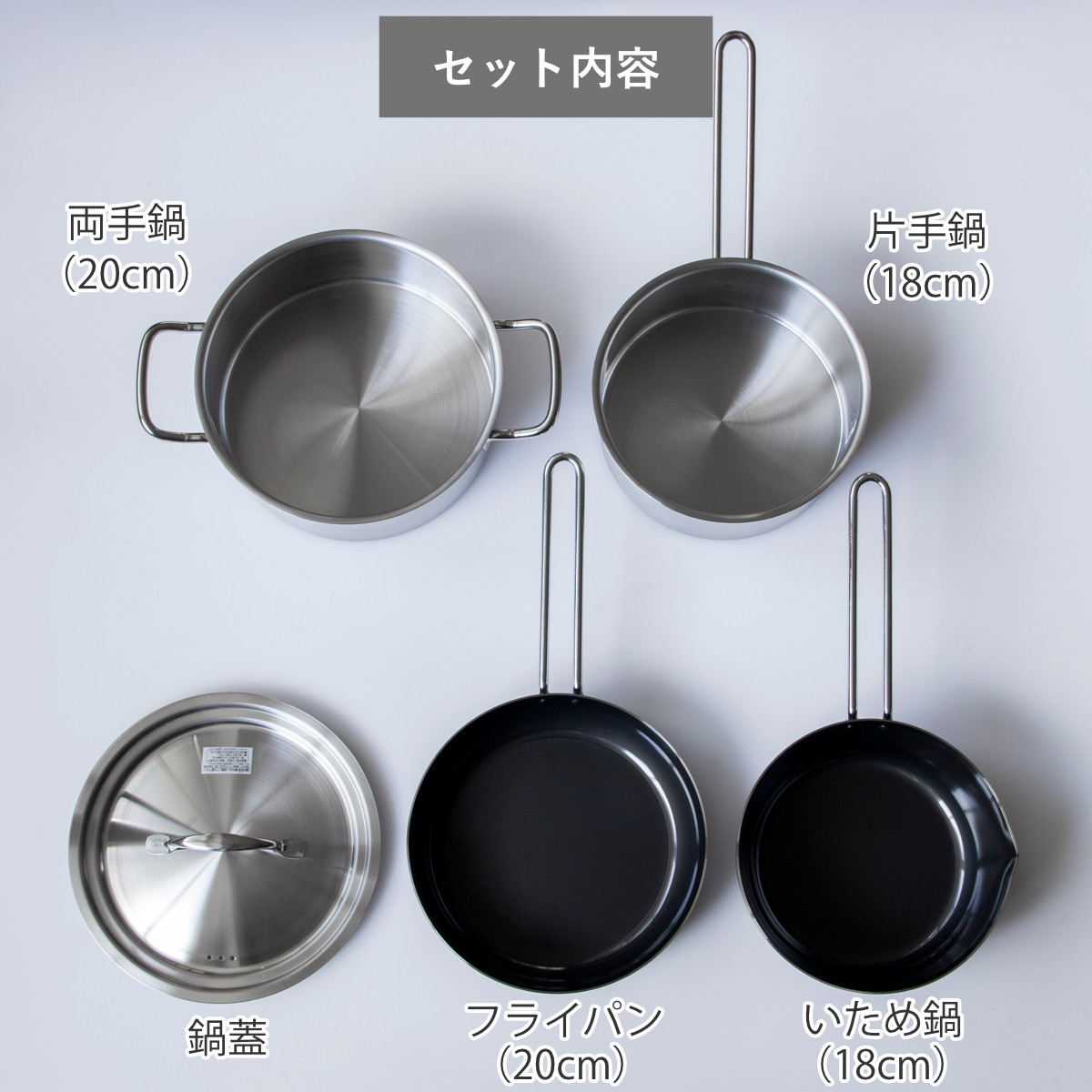 | 内容量 | 1セット(片手鍋、両手鍋、フライパン、いため鍋、鍋蓋) |