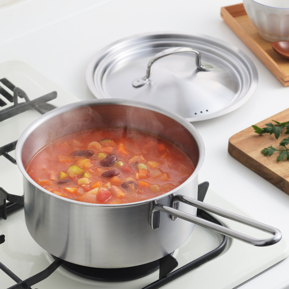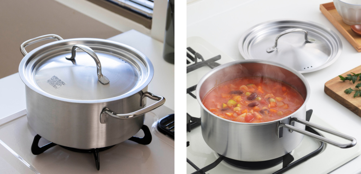 セットの蓋は、全ての鍋に使えるうれしい仕様です。鍋ごとに蓋を用意する必要がなく、省スペースでキッチンもすっきり整います。