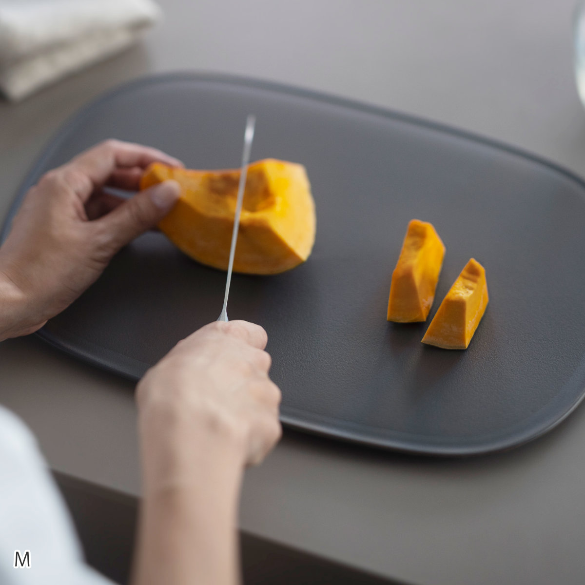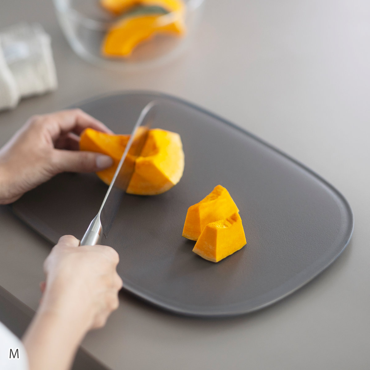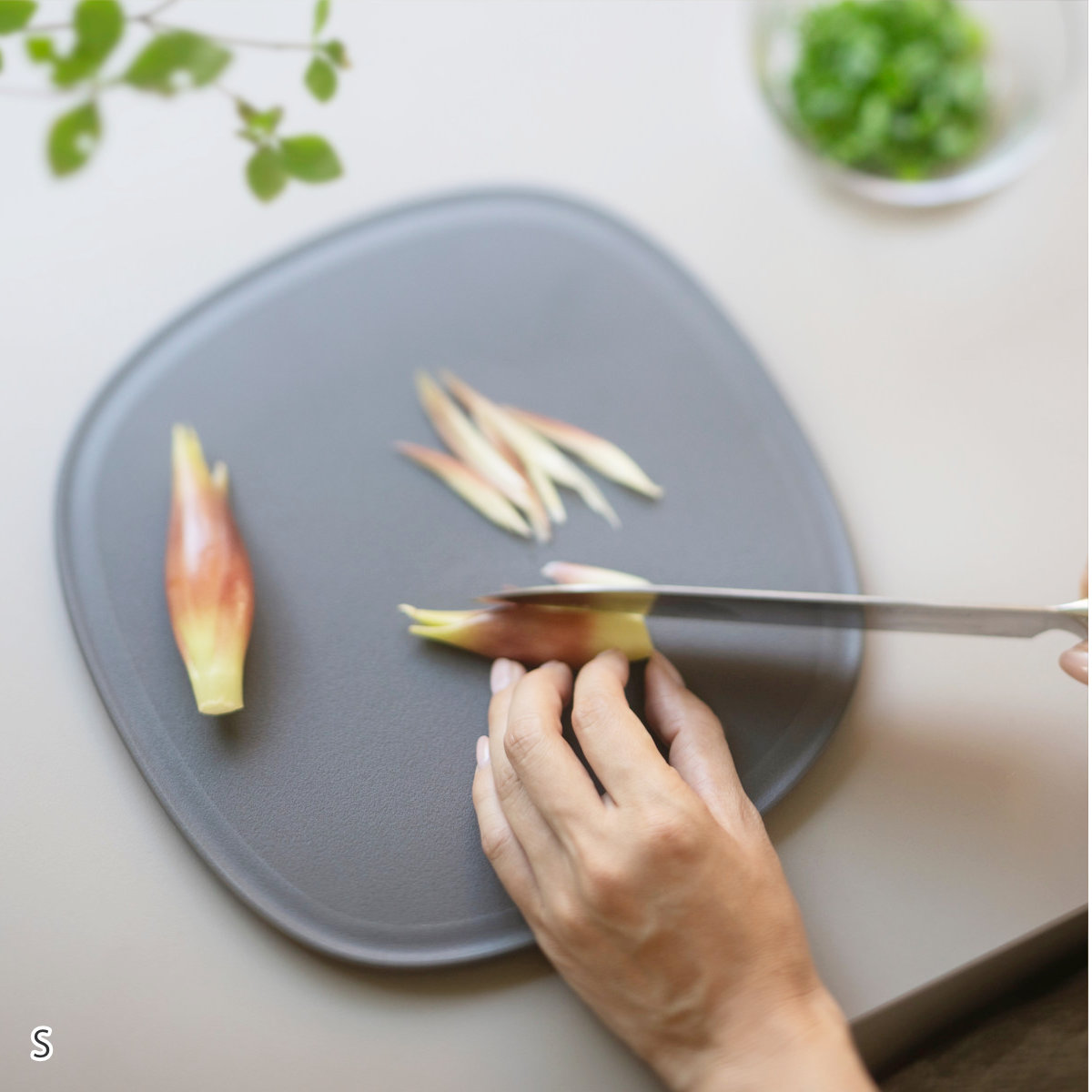裏面にある四隅のグリップと適度な重さで滑りにくく、安定して切れるまな板です。Sサイズは、ちょっとした食材を切る時に便利なコンパクトなサイズです。Mサイズは、葉物野菜からお肉、魚まで置ける日常使いにちょうどいいサイズです。
