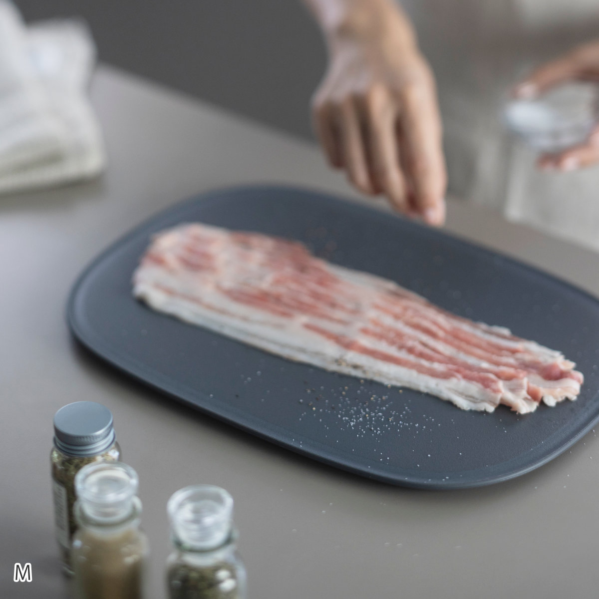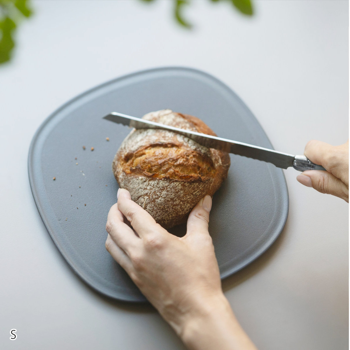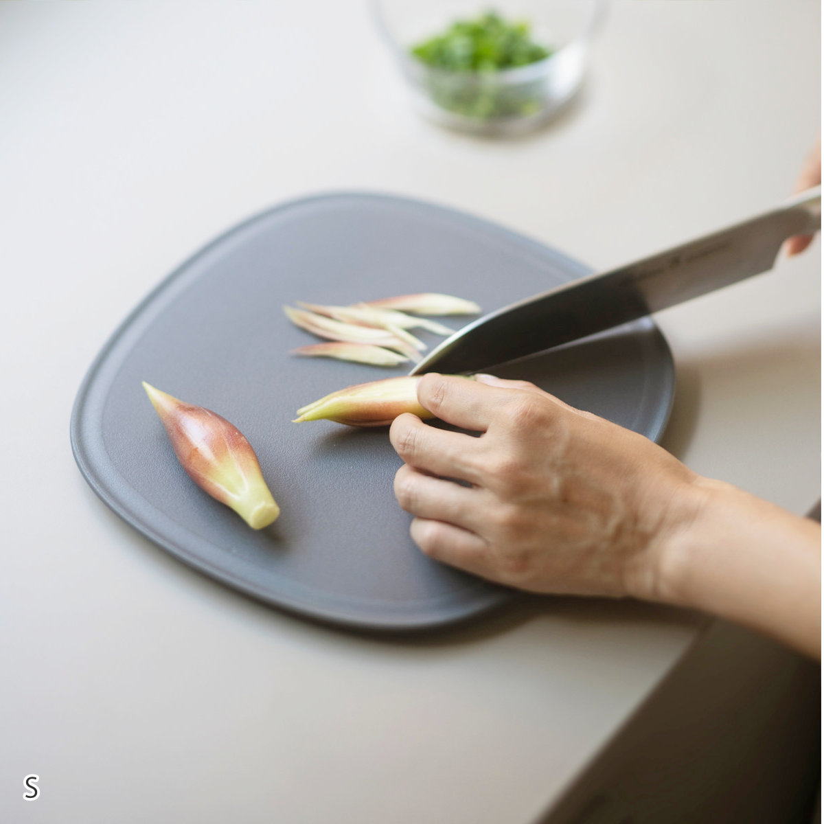 裏面にある四隅のグリップと適度な重さで滑りにくく、安定して切れるまな板です。Sサイズは、ちょっとした食材を切る時に便利なコンパクトなサイズです。Mサイズは、葉物野菜からお肉、魚まで置ける日常使いにちょうどいいサイズです。