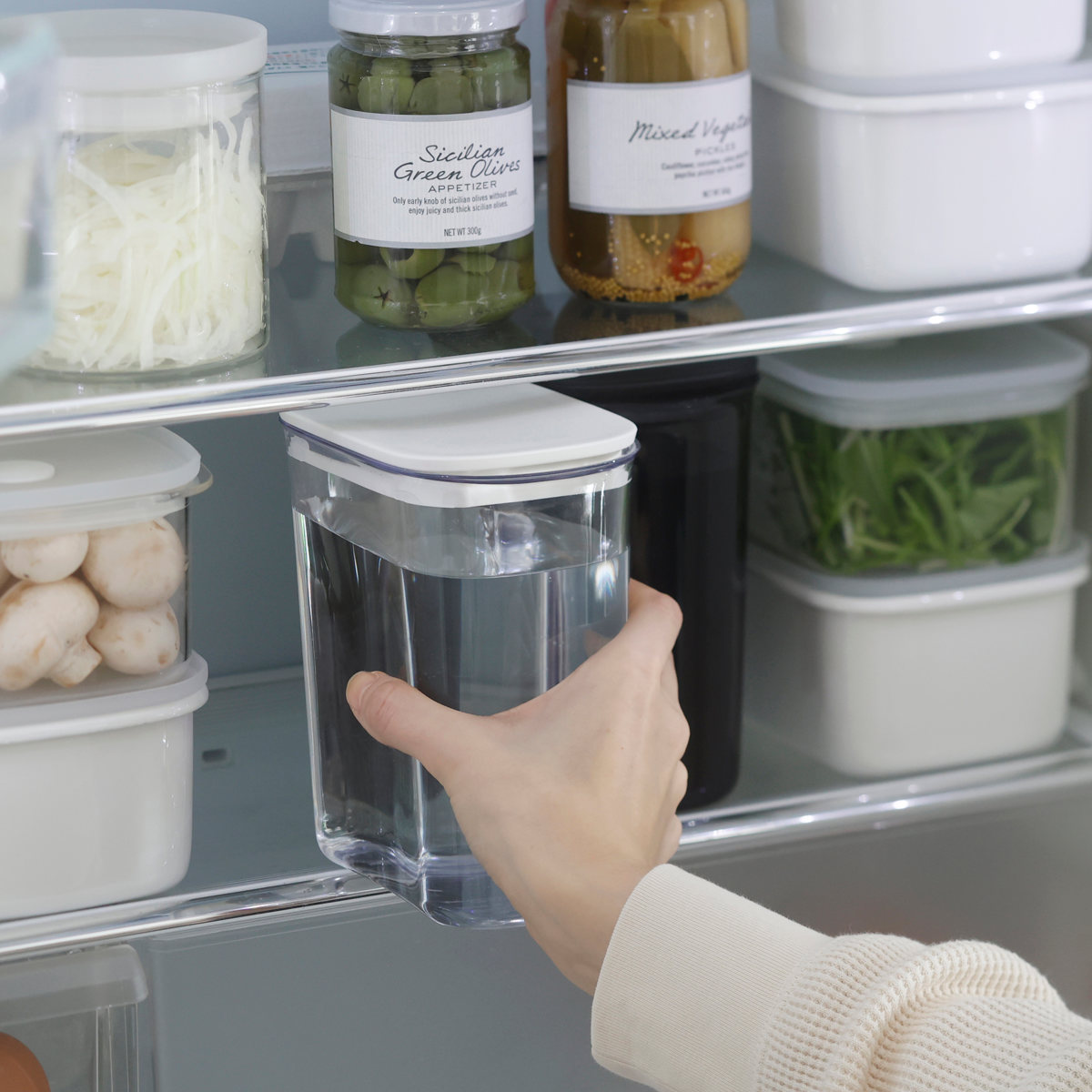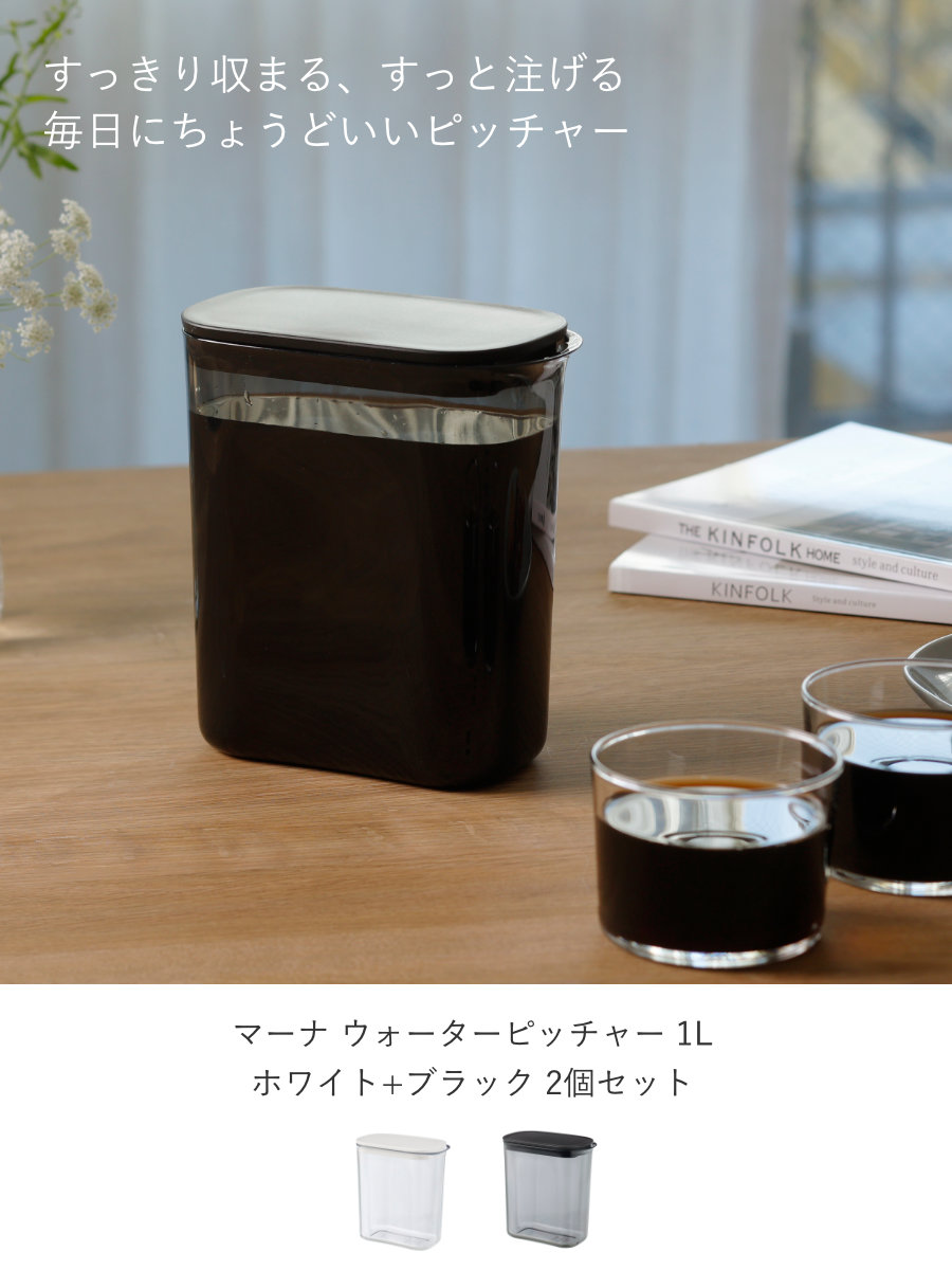 1~2人暮らしに使いやすい容量1Lです。スリム設計の冷水筒は、冷蔵庫のドアポケットにもスッキリと収まります。