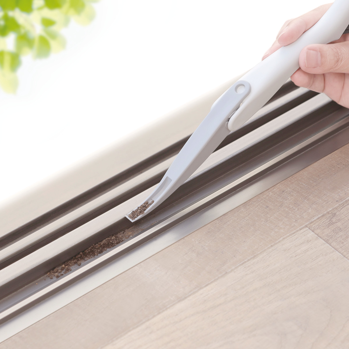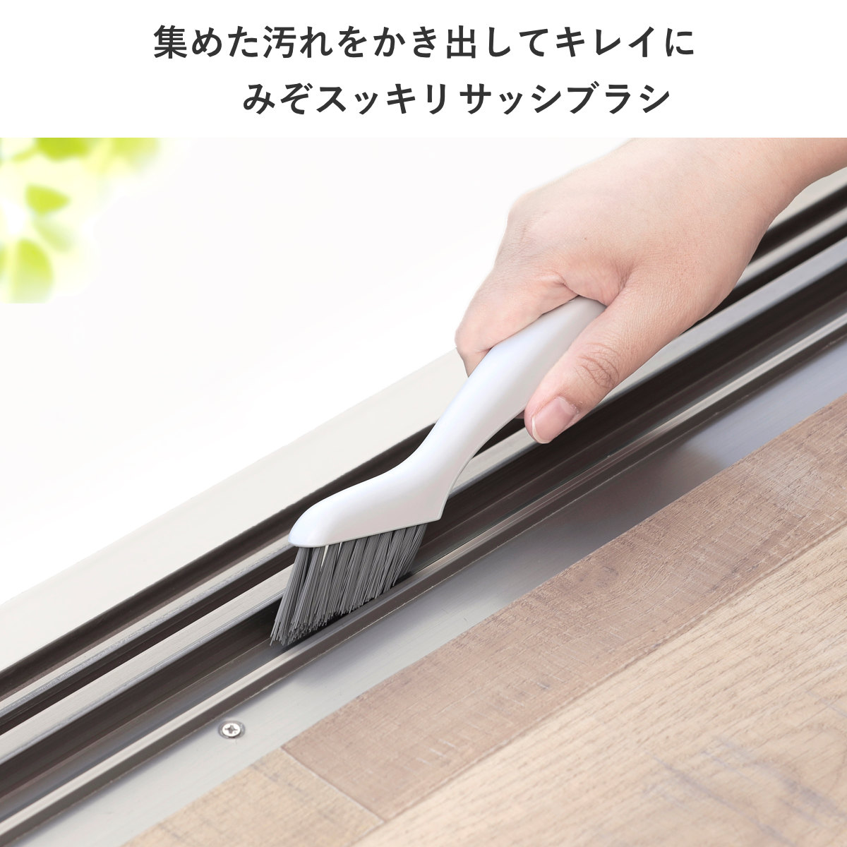 掃除しにくいサッシやミゾの汚れも、Vカットブラシがキレイに掃き出します。また、ちりとり機能付きスクレーパーが、こびりつき汚れをかきとります。毛の色はグレーで汚れが目立ちにくく、生活空間になじみます。