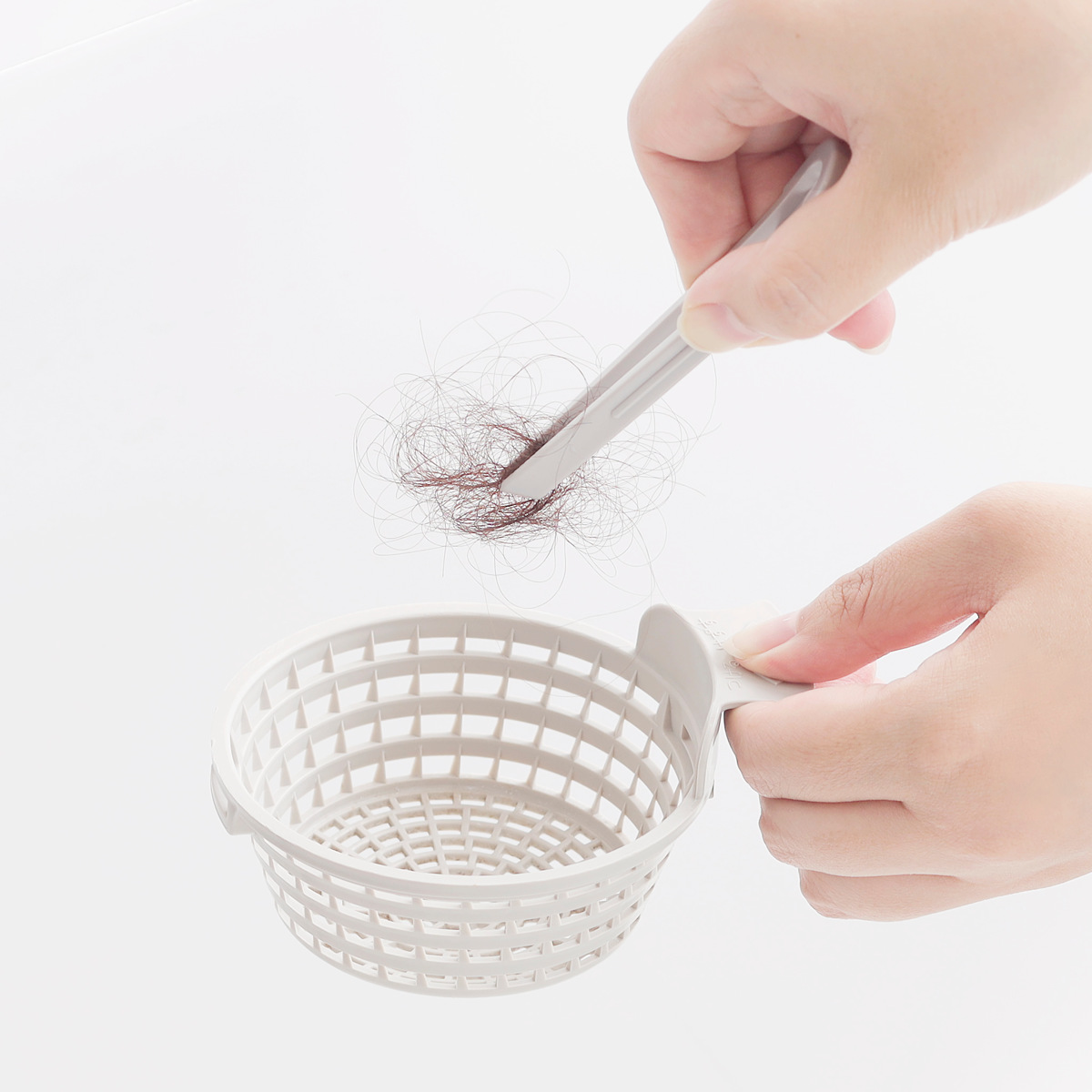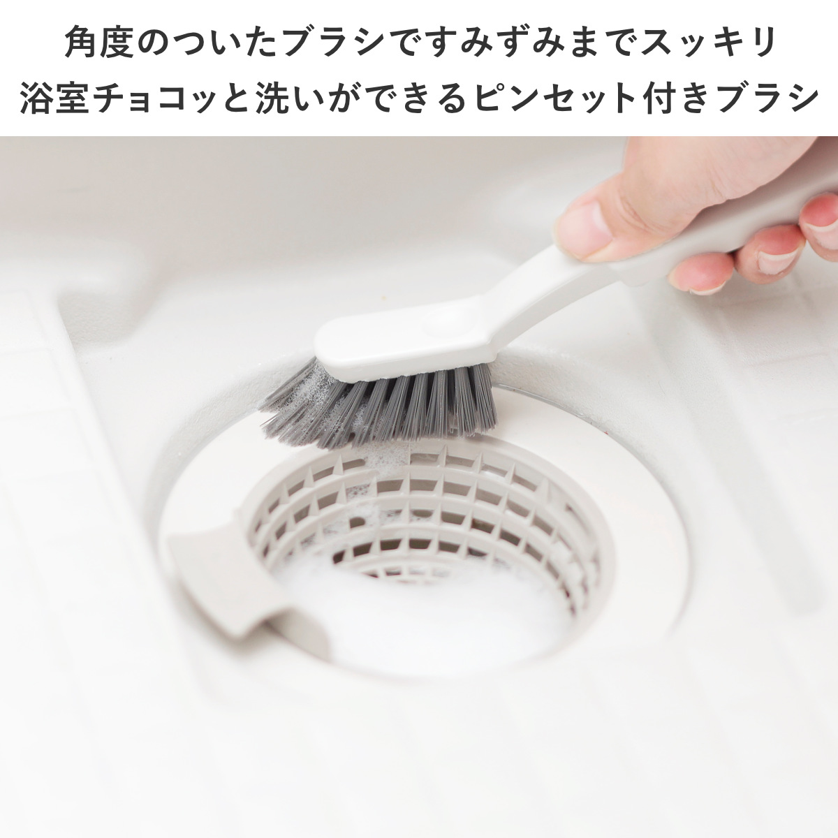 手で触れたくない排水口まわりの髪の毛やゴミがとれるピンセット付きです。先端が斜めでつかみやすくなっています。使わない時はブラシに収納できるので便利です。