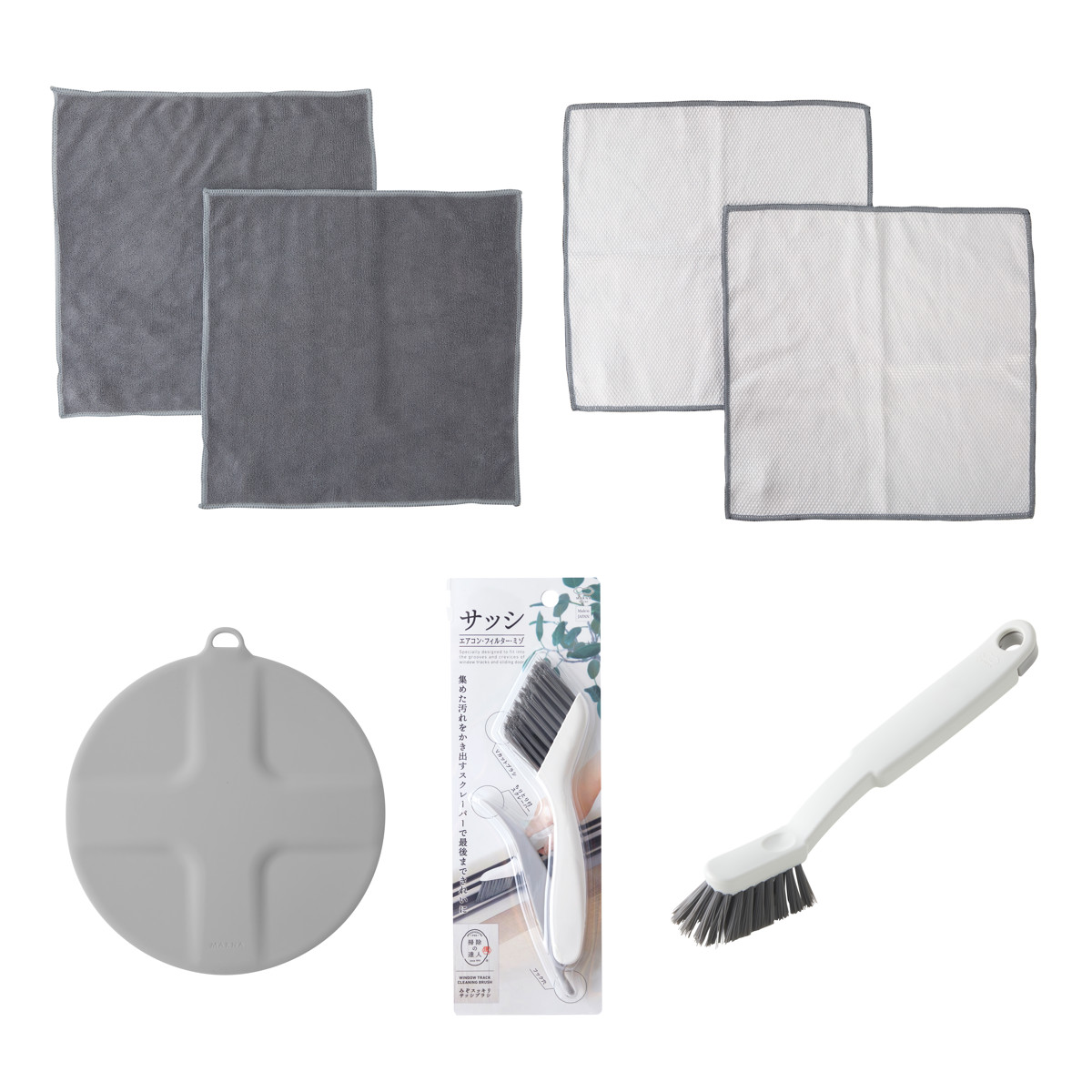 | サイズ | 【汚れからめ取りクロス】 約 横30×縦30(cm) 【ガラス・鏡ピカッとクロス】 約 横30×縦30(cm) 【つけ置き洗いキャップ】 約 幅17×奥行18.4×高さ0.6(cm) 【みぞスッキリサッシブラシ】 約 幅5.6×奥行20.3×高さ2.1(cm) 【浴室チョコッと洗い】 約 幅3×奥行21.5×高さ4.3(cm) |