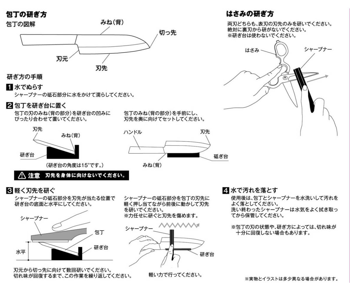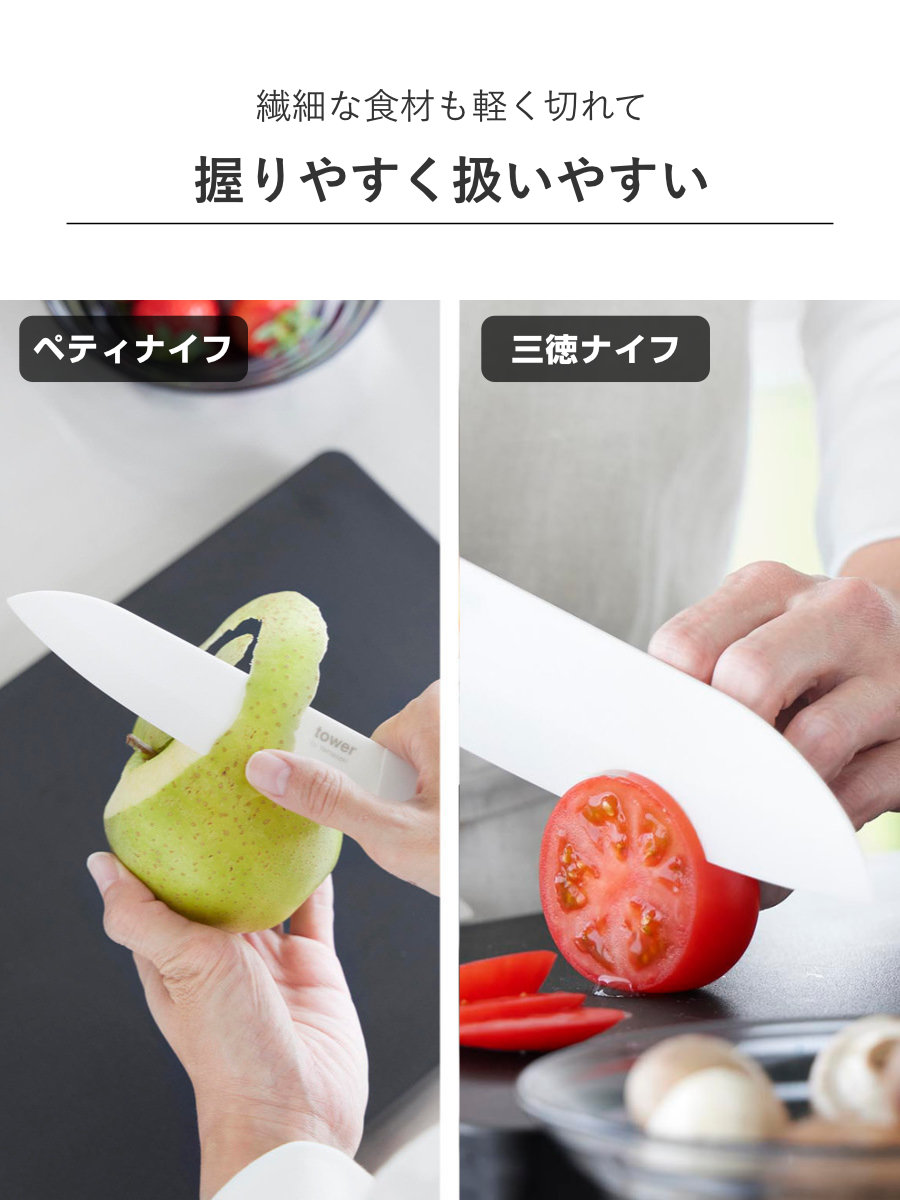 | 材質 | 【ペティ、三徳】 刃材:ジルコニアセラミック (刃付け形状/両刃付け) ハンドル:耐熱ポリプロピレン 【シャープナー】 シャープナー砥石:ダイヤモンド砥石(粒径#1200) シャープナーハンドル部:ABS樹脂 研ぎ台:ABS樹脂 滑り止め:ニトリルゴム |