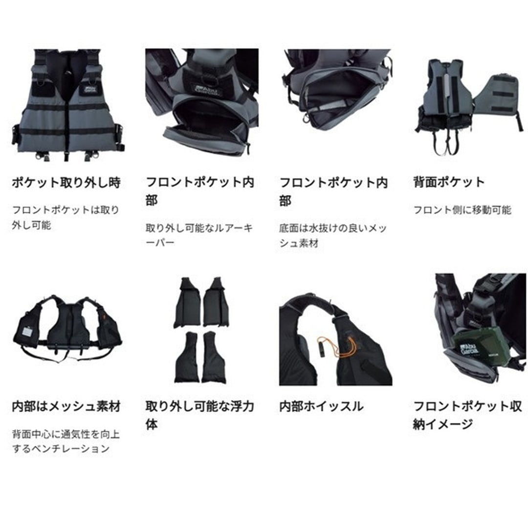 拡張性に優れ、この一着でシーバスやロックフィッシュ、エギング、サーフでの釣りなどに加え、フロントポケットを取り外せばSUP(スタンドアップパドルボート)などのアクティビティにも使用可能なフローティングベスト