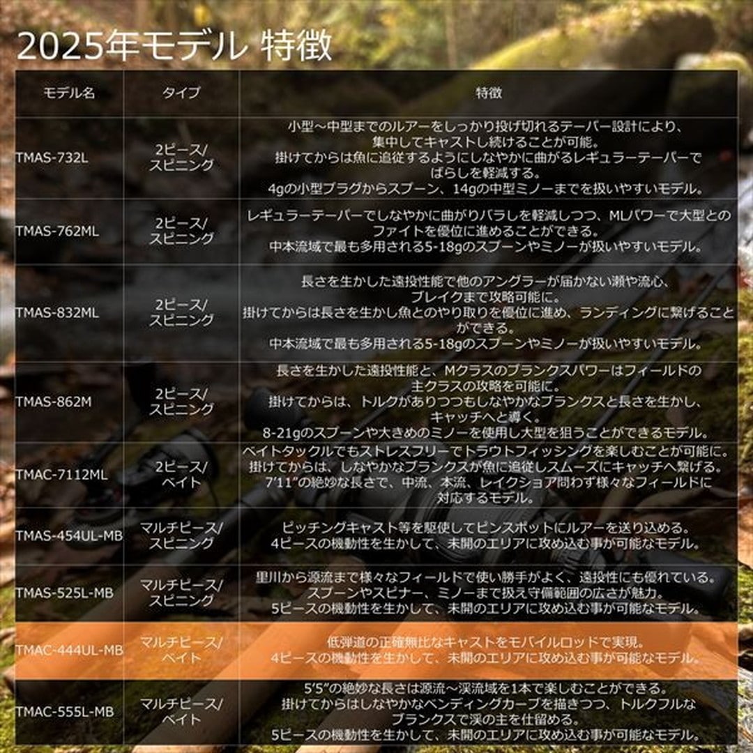 トラウティンマーキス アスレイはネイティブトラウト専用、東レT1100Gを使用しキャスティング精度とバラしにくさを追求したシリーズ!■TMAC-444UL-MB・・・ピンポイントを攻略、機動力×ベイトフィネスで攻める。「T1100G」を使用し、しなやかでネバリあるブランクス設計により、精度の高いキャストを可能に。低弾道の正確無比なキャストをモバイルロッドで実現。4ピースの機動性を生かして、未開のエリアに攻め込む事が可能。