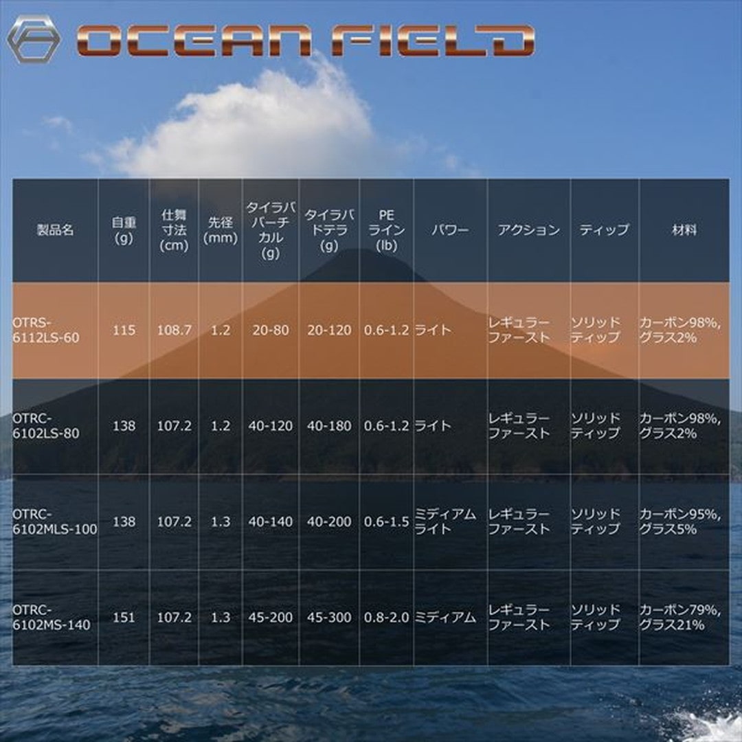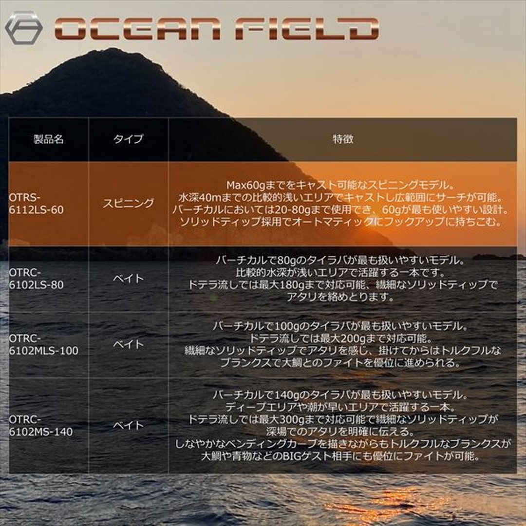 オフショアをもっと身近に!入門からベテランまで納得の一本!タイラバ専用モデル!■OTRS-6112LS-60・・・Max60gまでをキャスト可能なスピニングモデル。水深40mまでの比較的浅いエリアでキャストし広範囲にサーチが可能。バーチカルにおいては20-80gまで使用でき、60gが最も使いやすい設計。ソリッドティップ採用でオートマティックにフックアップに持ち込みます。