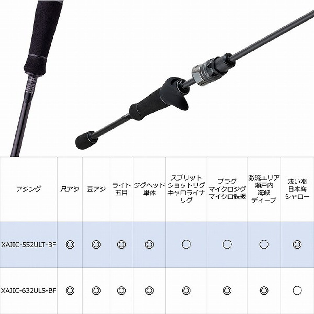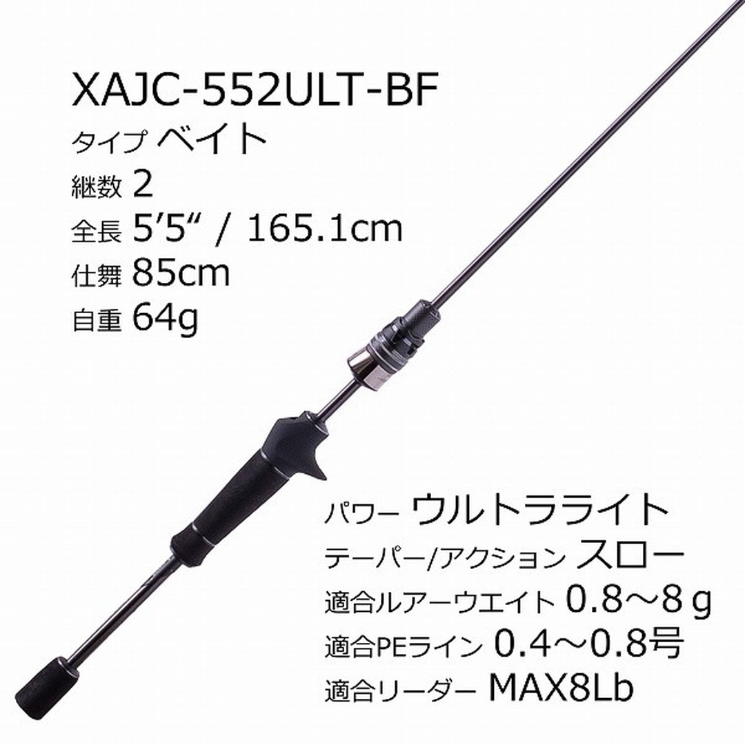 全魚種対応、あらゆるソルトウォーターゲームにマッチするロッド、『ソルティーステージ』が10年ぶりのフルモデルチェンジ。ハイエンドモデルにしか使えなかった、アブガルシア独自のブランクス製法、TAF(Triarchy Force)製法を採用。国産カーボン100%、完全無塗装のブランクスには、FUJI SiC‐S ガイドを搭載した。アジにフォーカスしたベイトフィネスモデル、XAJC-552ULT-BF。5フィート5インチのショートレングスで、スローテーパーのウルトラライトアクションがアジングゲームを盛り上げる。ブランクス全体がしなやかに曲がるスローテーパーで、ショートモデルにありがちなキャスタビリティ不足を解決。ジグヘッドによるリフト&フォールの掛けのスタイルに使用できる、軽さと感度を実現。メバル、カマスのほか、メッキやショゴといった小型回遊魚まで、さまざまな魚種をねらうことができる。
