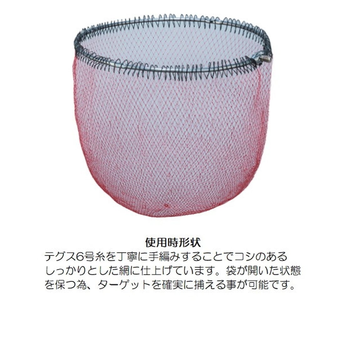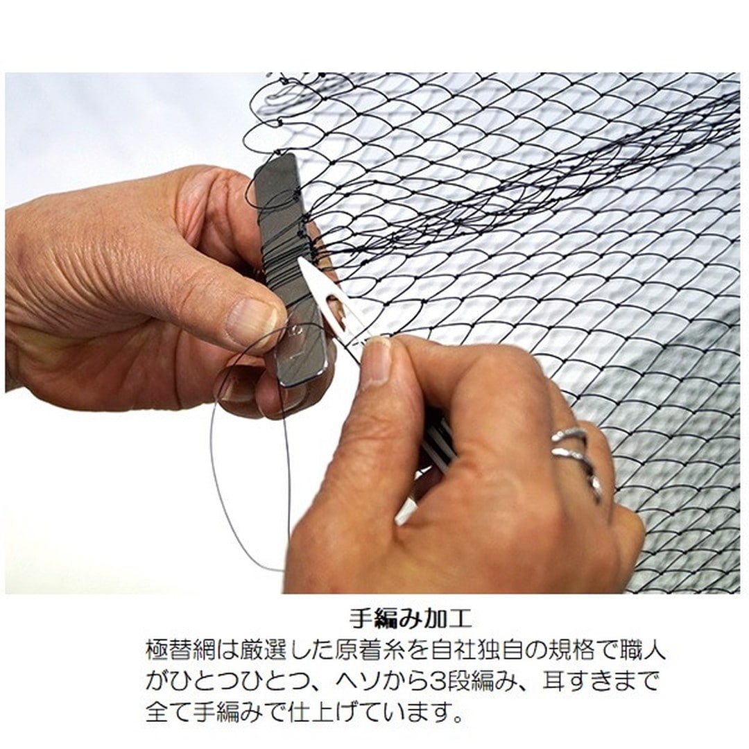 注目は、こだわりの3段編目。下から順に6mm目、8mm目、10mm目と、目の細かさをかえることで、棒ウキやアタリウキもすくうことができ、尚且つ網が開いた状態を保ちやすいので、ストレスなく魚をすくうことが可能です。また、60cm・70cmは大物用にテグス16号を使用し、耳すき部分も針絡みを外しやすいテグスを使用。※手編み加工の為、目の大きさ・長さは多少異なることがあります。