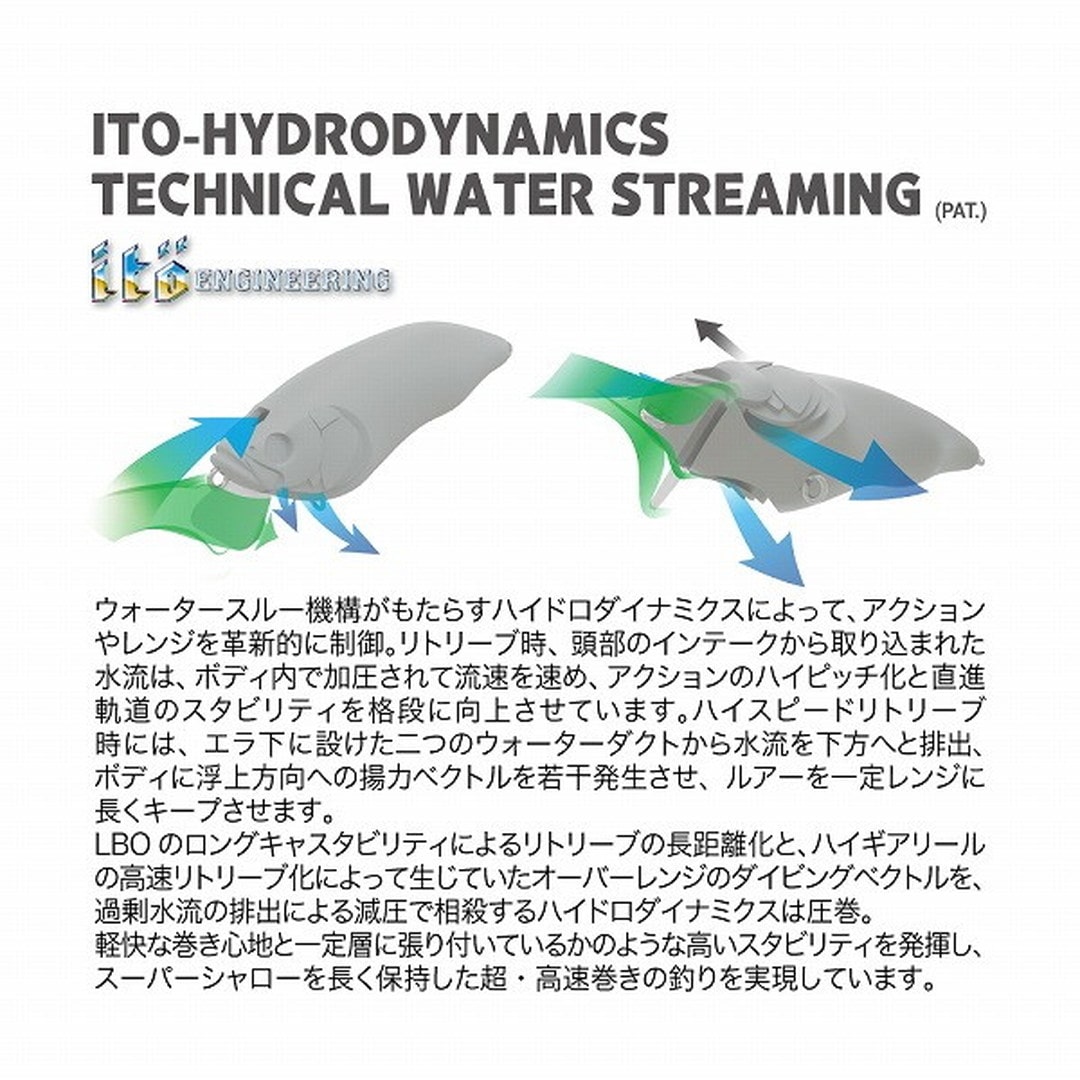 I×Iブランド、待望の第二弾。今江と伊東が今度も究極解を世に示す。稀代のハイスピーダーがついに完成。その名は、I×I「FURIOUS」。今江は、「フューリアス」の名の如く、猛烈なスピードで逃走するベイトに対するバスの襲撃本能を、極限まで引き出すエレメントを徹底追求。伊東は異次元のシャローランナーを具現化するため、POPMAX、XPOD、サイクロンなどで導入してきたウォータースルー機構(PAT.)を導入し、ボディ内に取り込まれた水流の作用によって、ルアーアクションやレンジ・コントロールなどを二次的に司るハイドロダイナミクスを追求してデザイン。FURIOUSの、バーチャルなリップの如く作用させるウォーターストリーミングは、圧巻という他ない。ハイスピードリトリーブ時は、頭部のインテークから流入した水流はボディ内で加圧され流速を速め、アクションと軌道のスタビリティを格段に高めている。