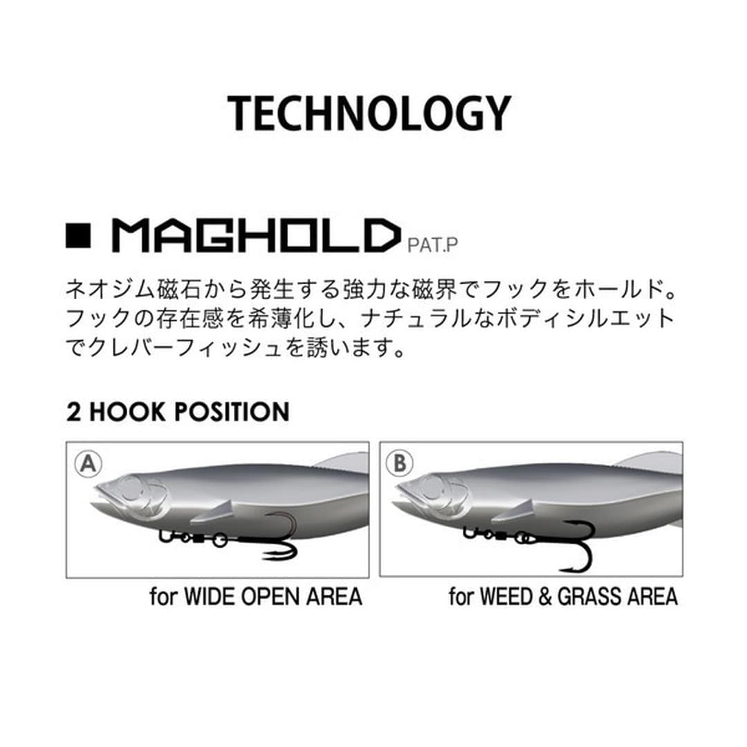 マグドラフトはスロー、ファストどちらでも、安定したリトリーブが可能なスイムベイト。アクションはウォブンロールを基本に、一般的なスイムベイトよりもややハイピッチに動きます。また、ベリー部のスリットとメガバス独自のマグホールドシステムでフックをボディへ密着。フックの存在感をカモフラージュし、魚への違和感を解消しています。