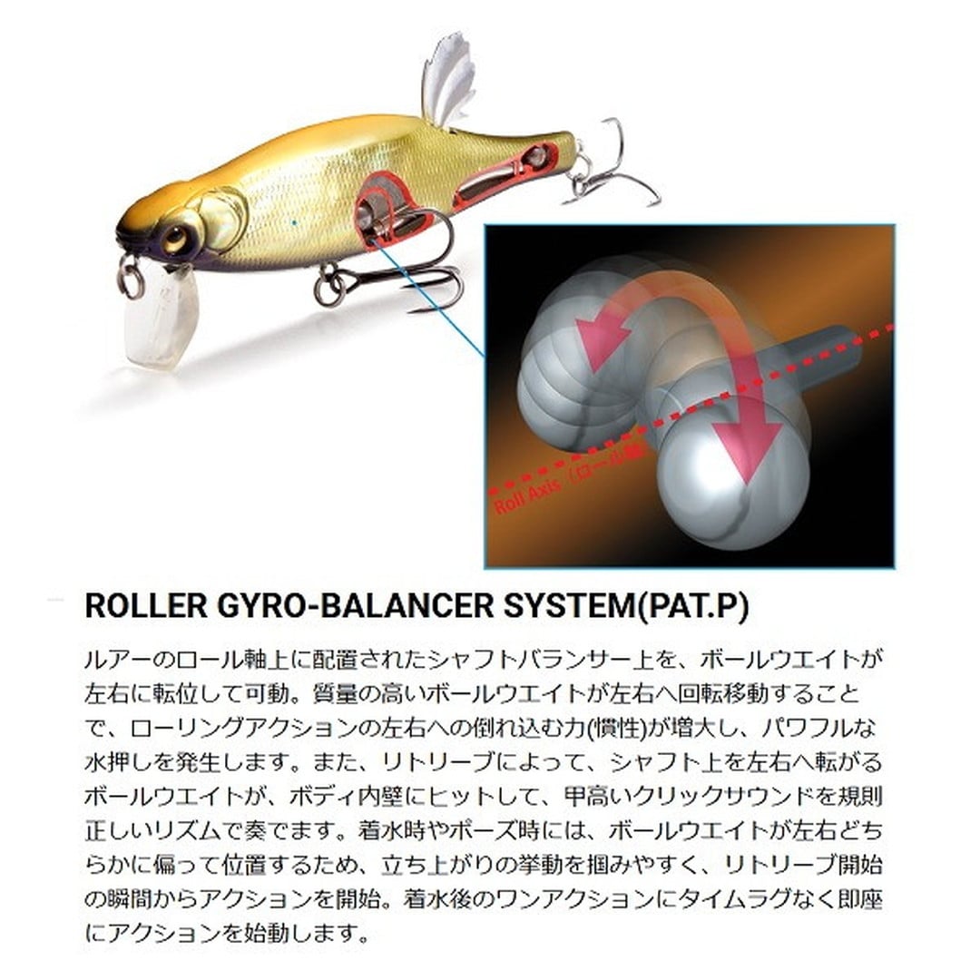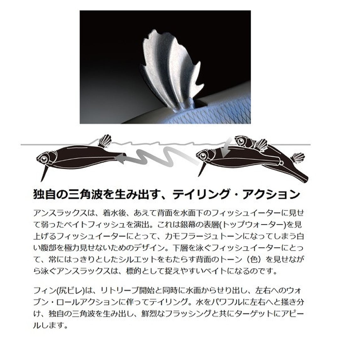 アンスラックスは、ローラージャイロ・バランサーシステム(PAT.P)によって、シャフトバランサー上を転位するボールウエイトが甲高いクリックサウンドを発生させ、多彩なマルチアクションを演出するウェイクベイト。スローリトリーブでは、水面でスーパーローリングアクションを生み出し、腹部のフィン(尻ビレ)が左右にテイリングして水流を掻き分け、独自の三角波でアピール。リトリーブ速度を上げると、水面直下10~20㎝程度をローリング・スイムするサブサーフェスシャッドとして活躍。また、ジャークによるスラッピングでは、水面でスプラッシュやバブルを発生させるボイルベイトを演出。ストップ&ゴーでは、ダイブ後にフラッタリングやライズアップするパニックベイトを再現。多彩なアクションとダイナミックなパフォーマンスがもたらすアンスラックス独自の釣獲力を是非フィールドでご体感ください。