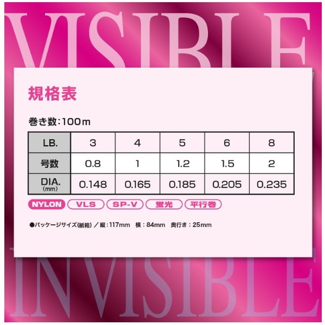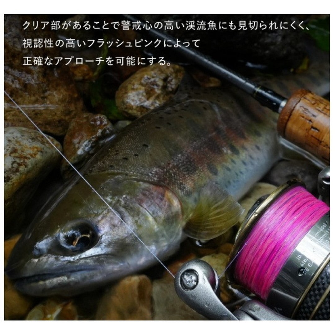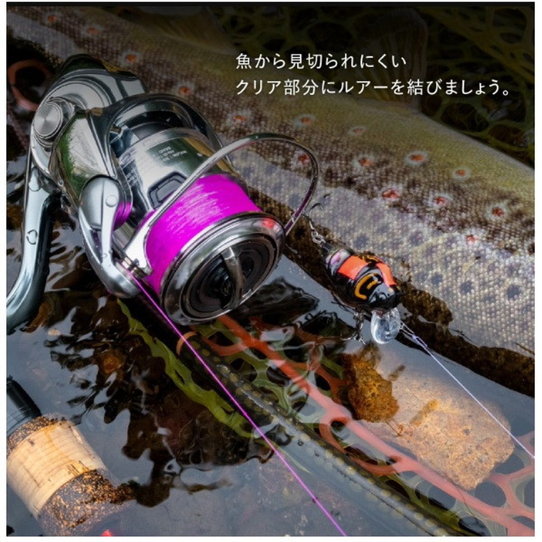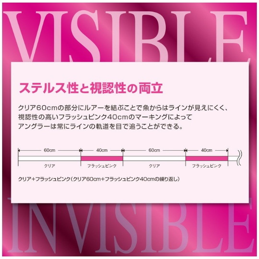 アングラーから見えて、魚から見えにくい。低伸度マーキングナイロンが思い通りのルアー操作を可能にする。◆低伸度。超低伸度ナイロン(VLS)を採用。伸びの少なさによってアングラーの意思をよりダイレクトにルアーに伝達する。◆ステルス性と視認性の両立。クリア60cmの部分にルアーを結ぶことで魚からはラインが見えにくく、視認性の高いフラッシュピンク40cmのマーキングによってアングラーは常にラインの軌道を目で追うことができる。◆使い方のコツ。魚から見切られにくいクリア部分にルアーを結ぶ。使用中はこまめにラインをチェック。根ズレ等によってラインに傷が入った時はもちろん、魚が釣れたり根掛かりを外したり強いテンションが掛かった時は必ず結びなおし、常にフレッシュな状態を保ちましょう。