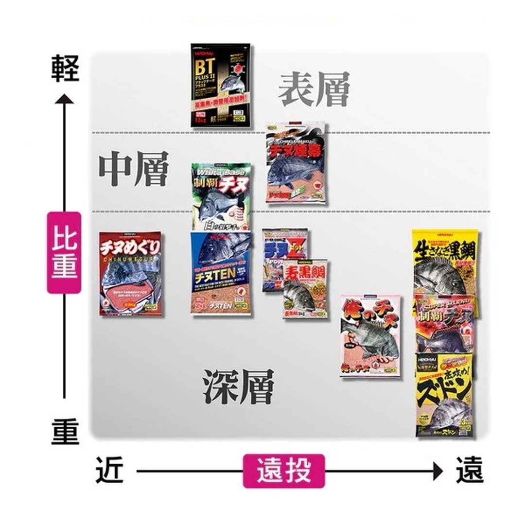 約10種類のチヌが好む具材を配合。視認性があり、高比重なため、底のチヌにアプローチできます。また微粉末タイプで沖アミや三陸アミとなじみやすく、まとまりの良い仕上がりとなっています。